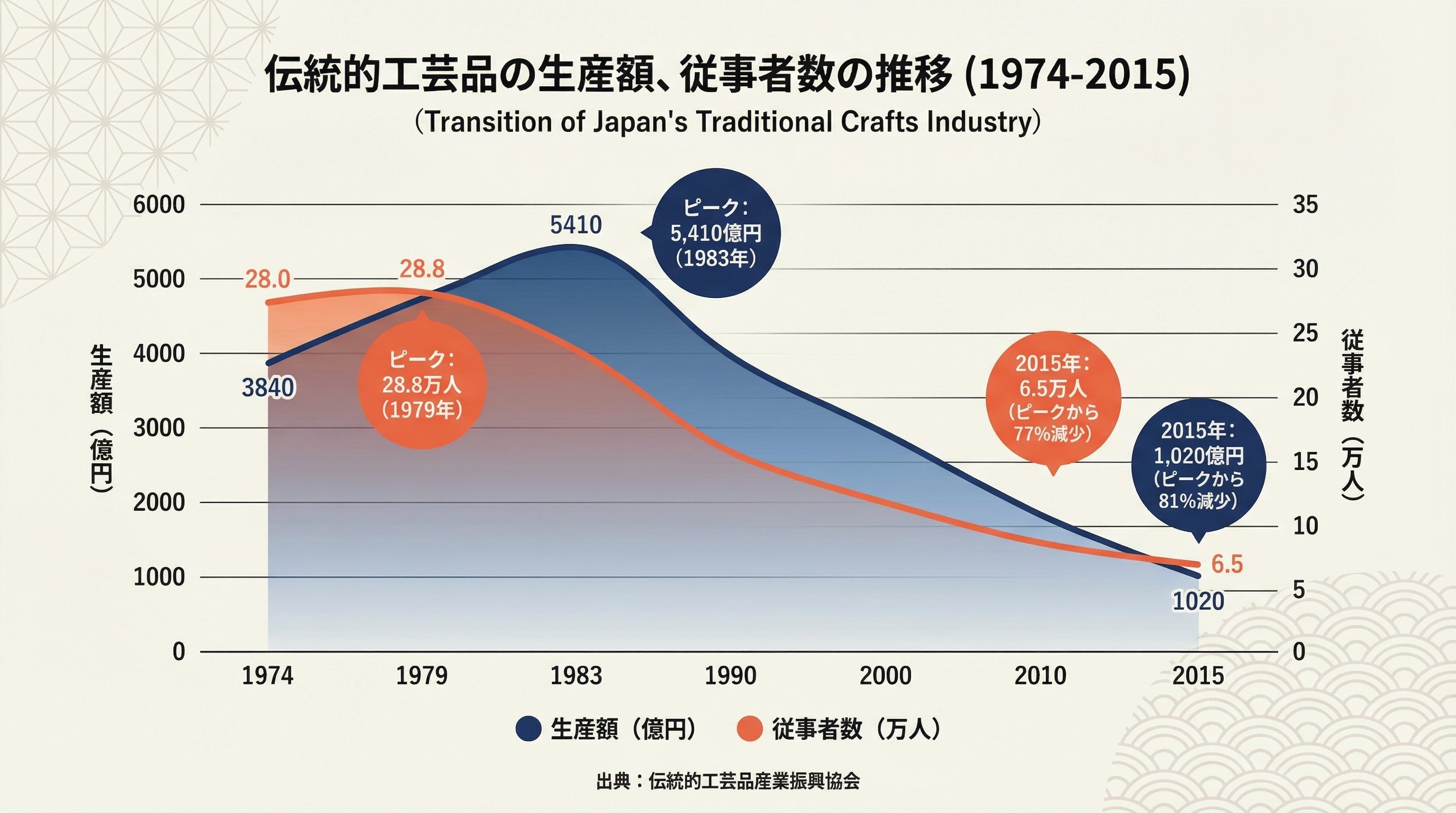 一般財団法人 伝統的工芸品産業振興協会の調査では、伝統的工芸品産業の従事者数は、1979年の約28万8千人から2020年には約5万4千人へと、最盛期の5分の1以下にまで減少しています。