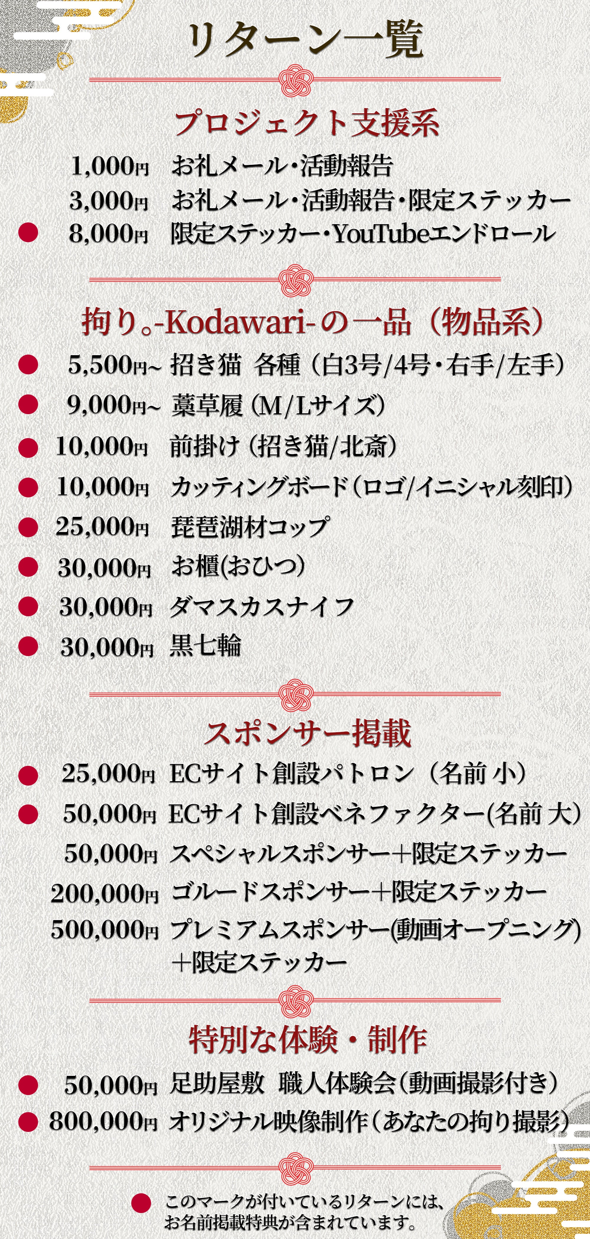 あなたの応援が、「日本の文化を守った証」として、永く残り続けるリターンです。