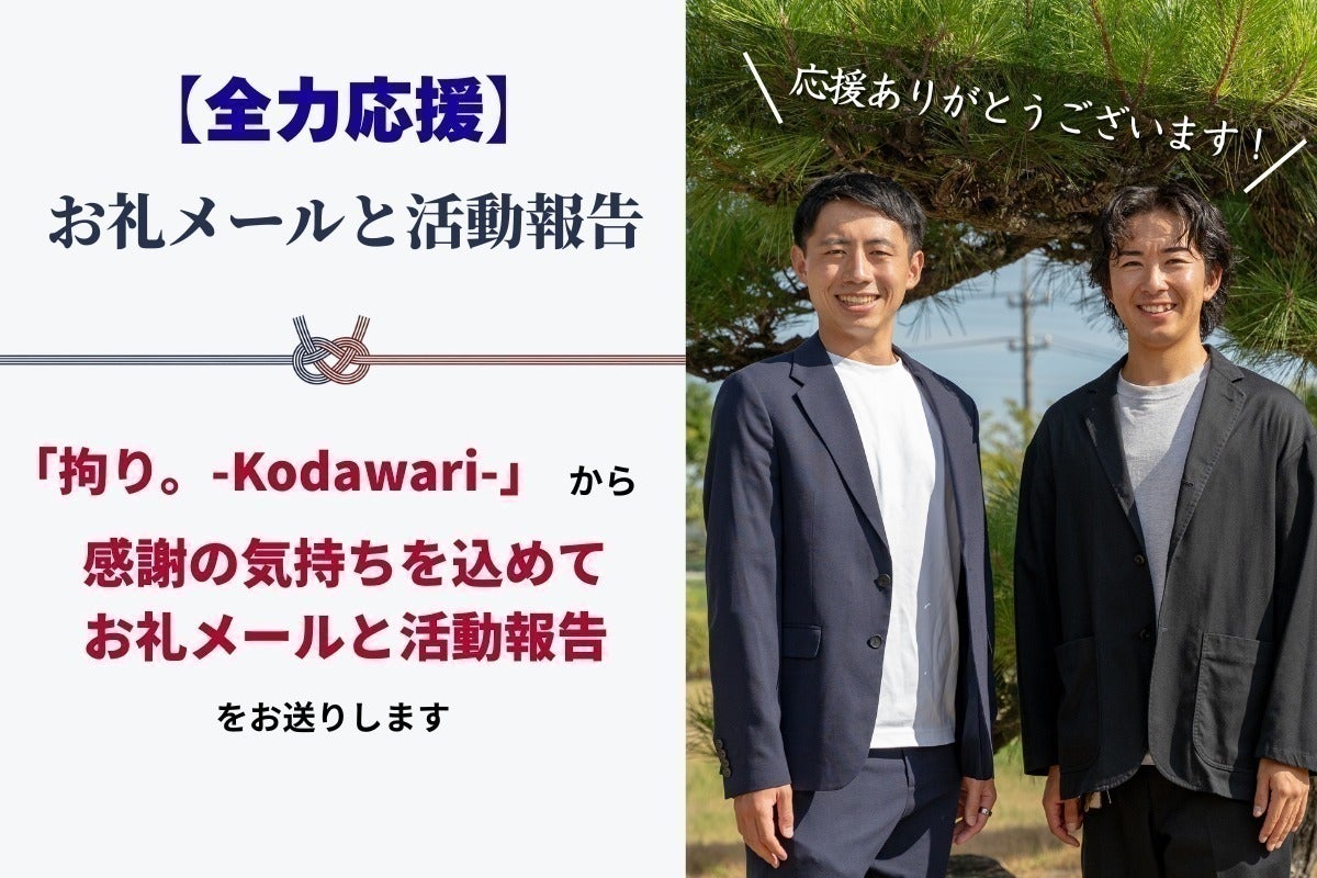 • いつも『拘り。-Kodawari-』を応援していただき、本当にありがとうございます。クラウドファンディング終了まで、残り4日となりました。ここまで、何度も率直な現状やお願いを発信してきました。ですが今日は、どうしても皆さまにお伝えしたいことがあります。それは、心の底からの感謝です。今回の挑戦を通して、僕たちは改めて気づかされました。「支援」とは、決してお金やリターンだけではないということです。もちろん、リターンという形で直接ご支援くださることも、本当に大きな力になっています。ですが、それと同じくらい、いやそれ以上に胸が熱くなる支えを、僕たちはたくさん受け取ってきました。自分のSNSで、僕たちの挑戦を熱い言葉とともに広げてくださる方。「こんな面白いことを本気でやっている若者がいるよ」と、大切なご友人に紹介してくださる方。何度も何度も「頑張れ」と声をかけ、背中を押し続けてくださる方。その一つひとつが、僕たちにとってどれほど大きな支えになっているか、言葉では言い尽くせません。見える支援も、見えない支援も。そのすべてが、僕たちをここまで連れてきてくれました。本当にありがとうございます。心から感謝しています。僕たち『拘り。-Kodawari-』は、日本の職人さんが命を懸けて繋いできた技術を、未来へ残したい。そして、その価値を世界へ届けたい。その一心で、今このクラウドファンディングに挑戦しています。今回つくろうとしているのは、ただのECサイトではありません。それは、日本の職人技と、世界を繋ぐための新しい道です。素晴らしい技術があっても、知られなければ届かない。想いのこもった手仕事があっても、買える場所がなければ残っていかない。だから僕たちは、動画で伝え、ECで届ける仕組みを本気でつくろうとしています。でも同時に、職人さんを支え、日本の文化を守る方法は、それだけではないとも思っています。「こんなすごい技術が日本にあるんだ」と誰かに話すこと。職人さんがつくったものを、日々の暮らしの中で大切に使うこと。この挑戦を、ひとりでも多くの人に届けること。そのすべてが、もう立派な“文化を守る行動”だと僕たちは信じています。残り4日。ここから先は、最後の最後まで、どれだけ想いを届け切れるかだと思っています。もしこのプロジェクトを見て、「日本の職人技を残したい」「この素晴らしい手仕事を未来へ繋ぎたい」そう少しでも感じていただけたなら、どうかその気持ちを、あなたなりの応援の形にしていただけたら嬉しいです。リターンという形でご支援いただくこと。SNSでこのページをシェアしていただくこと。ご家族やご友人に、僕たちの活動を伝えていただくこと。そのどれもが、僕たちにとってかけがえのない力です。皆さま一人ひとりの想いが集まることで、この挑戦は、ただのクラウドファンディングではなく、日本のものづくりの未来を守り、世界へ届ける大きな一歩になると信じています。最後の最後まで、僕たちは全力で走り抜けます。この挑戦に、魂を込めてぶつかります。どうか引き続き、温かい応援とご伴走をよろしくお願いいたします。拘り。-Kodawari-寺澤大智 / 杉浦惇希 もっと見る
