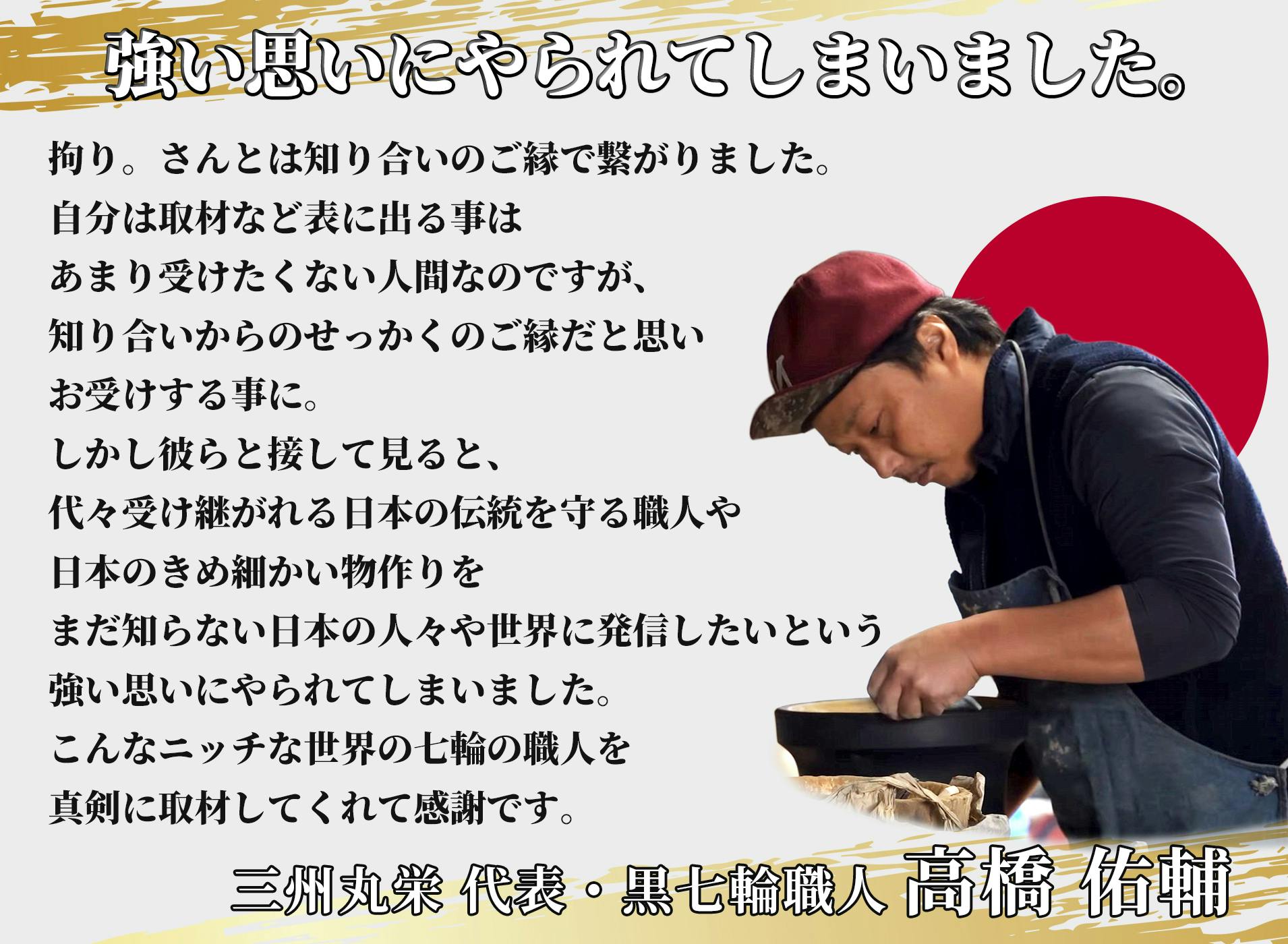 三州丸栄 代表・黒七輪職人 高橋佑輔さんから応援メッセージをいただきました