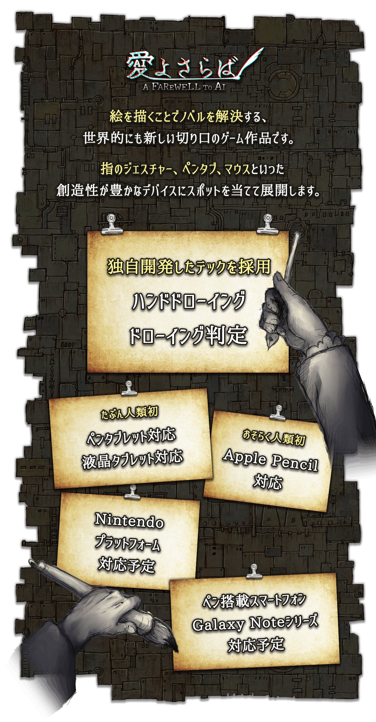 物語はあなたの絵を中心に進みます。描いた絵がストーリーを進める、今まさに進み始めた新たなテクノロジーを使った、新しい感覚が味わえるゲームが『愛よさらば』です。