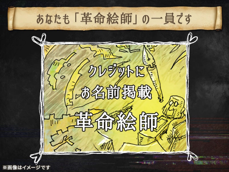 ゲーム内のスタッフロールに特別枠を設けて、あなたのお名前を「革命絵師」の一員として掲載します。絵を描くのが好きな方、絵師になってみたい方、事情により絵から離れてしまった方も、誰がなんと言おうと私たちの仲間です。