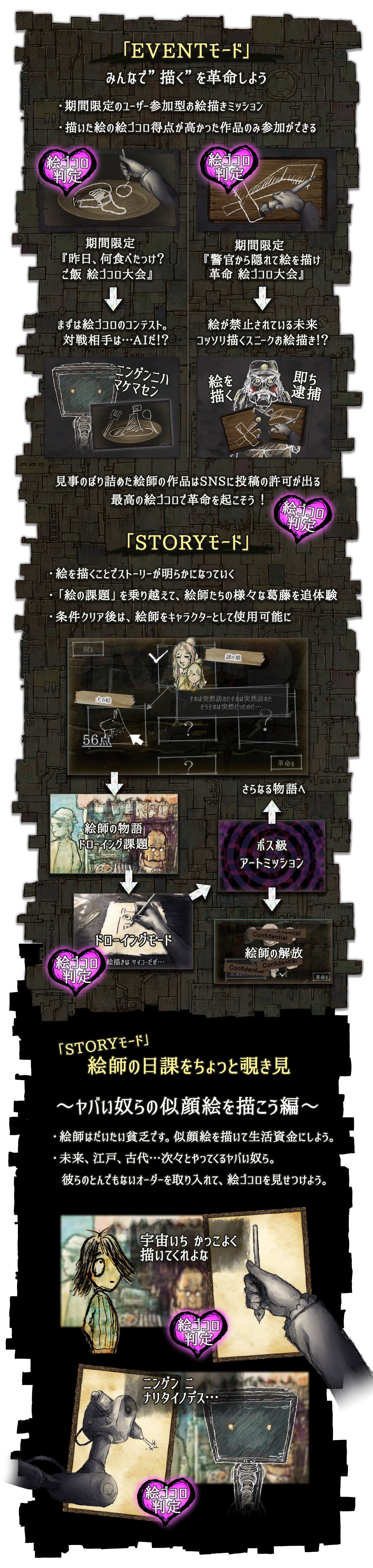 ・「STORYモード」… 絵を描いて課題をクリアし、物語を解放していくコンテンツ