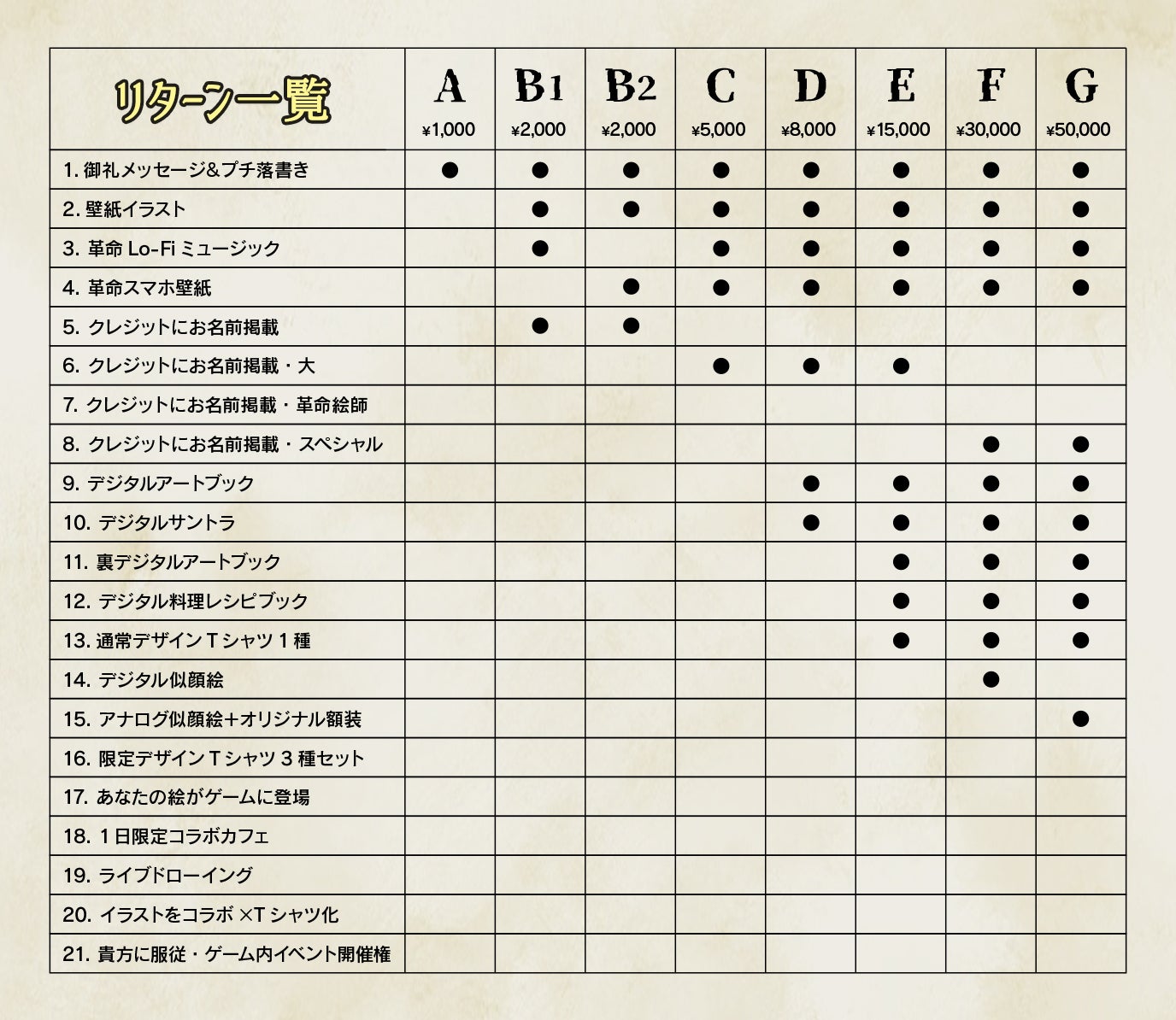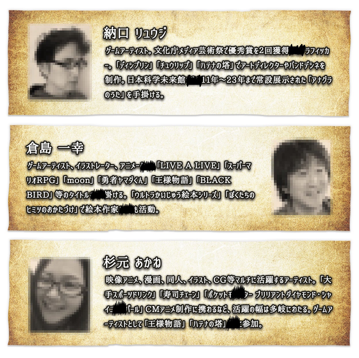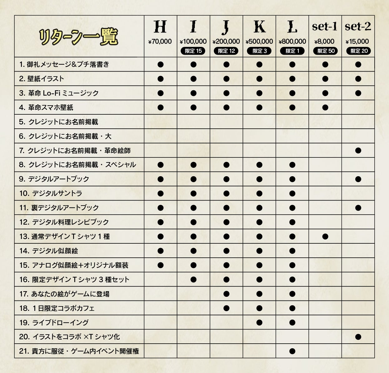ゲーム内のスタッフロールに特別枠を設けて、あなたのお名前を「革命絵師」の一員として掲載します。絵を描くのが好きな方、絵師になってみたい方、事情により絵から離れてしまった方も、誰がなんと言おうと私たちの仲間です。
