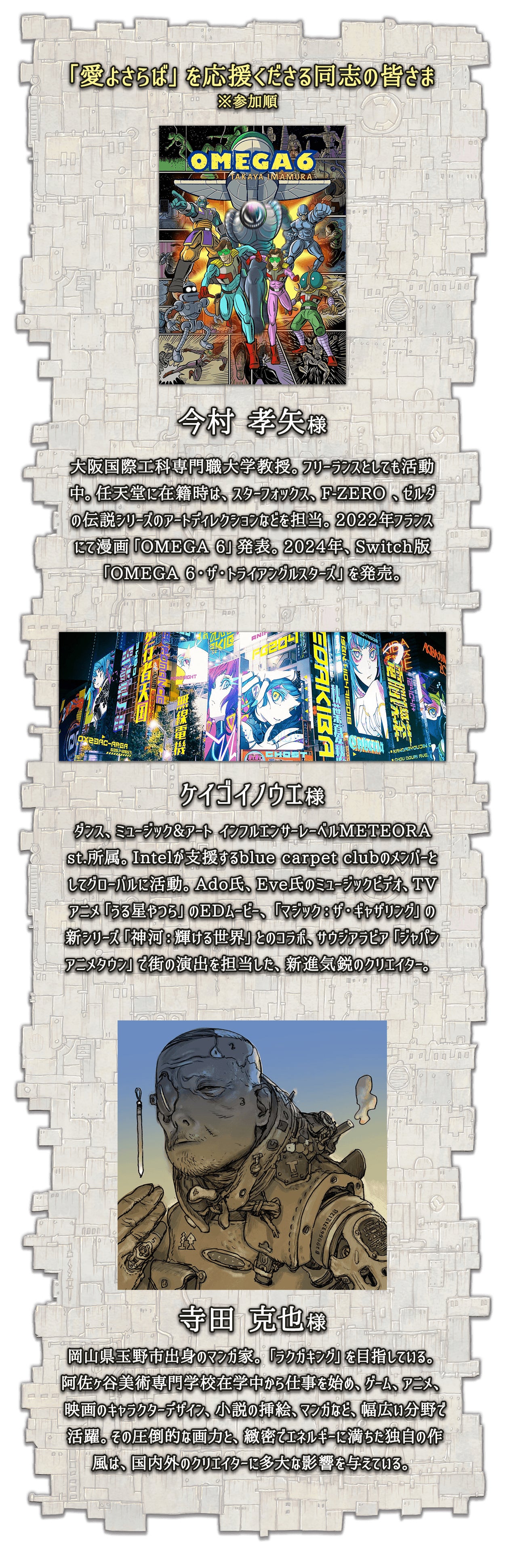『愛よさらば』は、志を同じとするクリエイターの皆さまに応援いただいております。”アートを題材とする珍しいゲーム”として、アーティストの皆さまの益々のご発展を後押しする、”アート業界を盛り上げていくゲームでありたい”と思っています。そして、共に盛り上げていただける同志クリエイターの皆さまを募集しております。気軽にお声掛けいただけますと嬉しいです。