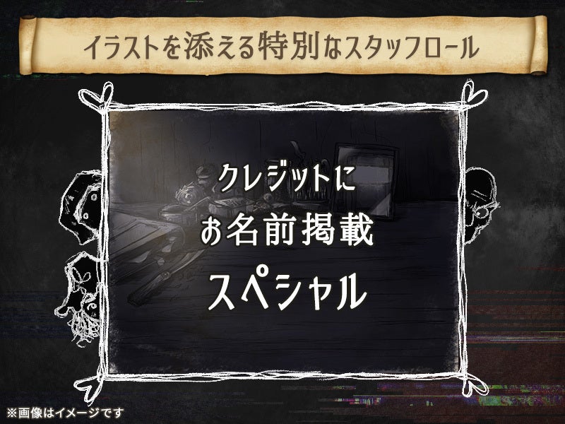 ゲーム内のスタッフロールに、あなたが描いたイラストをアイコンのように添えて、ひときわ目立つかたちでお名前を掲載します。作品の中に“あなたの表現そのもの”を刻み込む、特別なスタッフロールを体験していただくことができます。