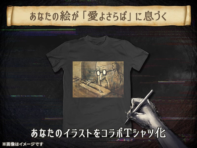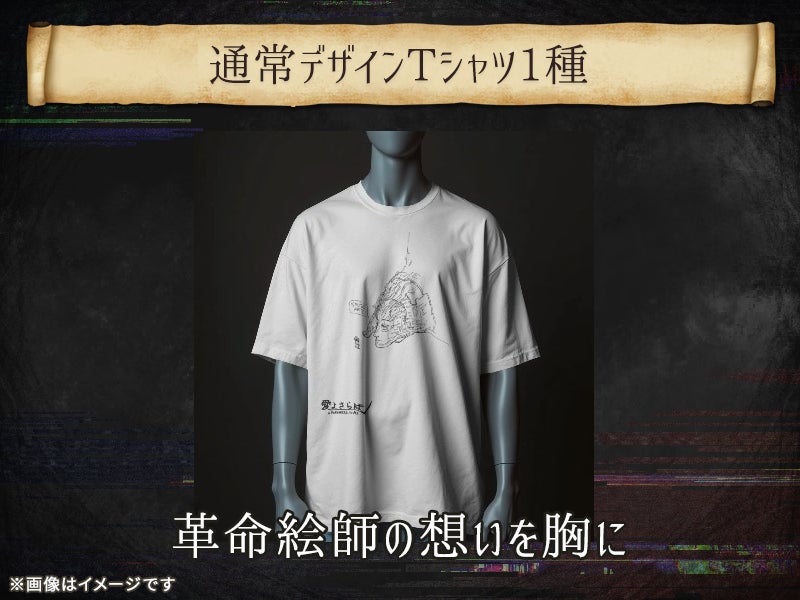 イラストはTシャツの中央に大きく配置。そのまわりを、革命絵師(アート担当スタッフ)がさりげなく装飾します。「愛よさらば」の世界に、あなたの絵がしっかり息づく、記念にぴったりなコラボTシャツです。