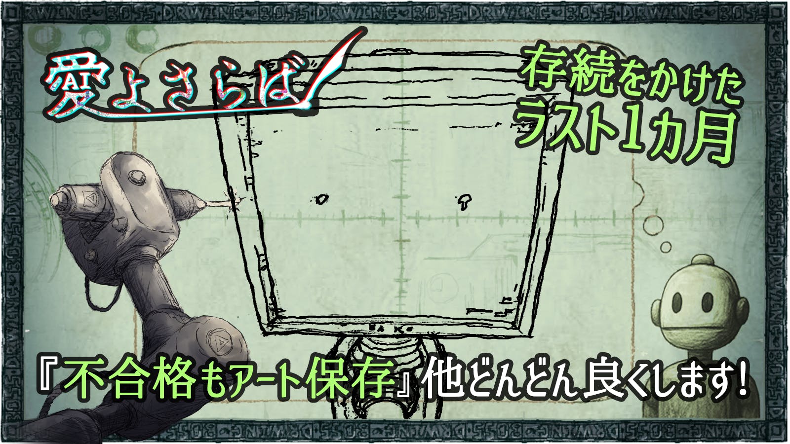 【最後の1週間。9月30日まで】皆さま、いつも愛よさらばの応援をありがとうございます。けっこう珍しいゲームだけれど、けっこうアングラなアートだけれど、今まで150名以上の同志の皆さまからのあたたかいご声援と、ご支援でここまで来ました。愛よさらばの開発存続をかけたクラファン、ついに最後の1週間です…!『最後の1週間』クラファンのゴール達成、そして開発の存続決定まで…もうひと踏ん張りです!未来ある挑戦を何とぞ応援、ご支援をお願いします!共に勝利を!革命絵師と同志の皆さまと共に…必ず勝利を!!皆さまからのご声援: https://camp-fire.jp/projects/848935/view/backers#menuuser_51c0aa7560d4『絵をかく人たちのお話し。とてもすてきな着眼だと思いました。』user_7ca9da01a614『Switch2のマウス機能と絶対に相性が良いゲームだと思います!』pocomicro『いまの時代にふれたい作品、どうか完成されますように。』皆さまからのあたたかい応援が本当に励みになっております。あと1週間、がむしゃらにがんばります!本日は現状のまとめや叫び、東京ゲームショウのご紹介等です。【最後の1週間。クラファンの状況は…?】達成まで残り30%とすこし…!ゴール達成が見えていますが、まだ達成はできていません!な、謎のロボさん、そのあたりどうでしょうか!?計算をお願いします。「ウィーン!(ぼくはお絵描きロボだからわからないけど…きっと大丈夫!)」CAMPFIREページのビュー数も先週と同様に好調をキープしています…!『最後の1週間』クラファンのゴール達成、そして開発の存続決定まで…もうひと踏ん張りです!未来ある挑戦を何とぞ応援、ご支援をお願いします!共に勝利を!【ここでしか手に入らないレアな返礼品!9月30日まで】Xでは9月末までキケンでレアな返礼品を夜な夜な紹介しています。公式Xをフォローしてみてください!公式X:https://x.com/uzz_inc「イラッシャ~イ。闇ノ文房具屋なノ。夜な夜なキケンでレアな商品を紹介するノ。今夜はコチラ『愛よさらば革命をまとめた デジタルアートブック』。バンドデシネという独特なマンガ芸術のアングラなアート世界が詰まった貴重な一冊なノ」「イラッシャ~イ。夜な夜なキケンでレアな商品を紹介するノ。2日めの今夜は『愛よさらば革命の“裏”世界アートブック』。絶対に語られることがない裏世界の葛藤、暴露話や出来事をアングラなアートで彩ったヤバい一冊。書いてある内容は絶対にヒミツなノ」「イラッシャ~イ。夜な夜なキケンでレアな商品を紹介するノ。3日めは『愛よさらば革命の情景が詰まったサウンドトラック』。とにかく一曲聴いてみて、この最高のグルーヴを【https://x.gd/sn44v】」『最後の1週間』クラファンのゴール達成、そして開発の存続決定まで…もうひと踏ん張りです!未来ある挑戦を何とぞ応援、ご支援をお願いします!共に勝利を!【東京ゲームショウで会いましょう!】ありがたいことに、日本最大級インディーゲームの祭典BitSummit様から今年の1作に選んでいただいた本作、『HALL10インディーゲームブース:10-E16』でBitSummit様と一緒に出展します!公式Xフォローの同志の皆さまには、無料でステッカーをプレゼント!そんでもって、ステッカーの裏に「当たり」があれば、Tシャツやアクスタなどの超レアアイテムが貰えちゃうかも!?数量限定、早い者勝ちなのです!ここでしか手に入らない愛よさらばなステッカーをプレゼント!リュウズ&ウズシマ画伯の物販もあるよ!「ウィーン(10-E16です。…いえ、私の名前ではありません)」ガチでかい看板が目印。四十肩に負けずがんばります!『最後の1週間』クラファンのゴール達成、そして開発の存続決定まで…もうひと踏ん張りです!未来ある挑戦を何とぞ応援、ご支援をお願いします!共に勝利を!おまけ!この1週間、公式Xで一番ファボったのは『心がよめる少年(のもふもふした犬)』でした!ということで同志の皆さまへおまけの描きおろし1枚です!(ぼくはなんだか呼ばれてる気がするんだ…。こっちだ。こっちの方だ) (ぼくはなんだかおかしのホネをかみかみしたい)↓ 愛よさらばのまとめです。<プロモーションビデオ> <遊び方&ストーリー紹介動画> <無料お試しiPhone/iPad版> ⇒ https://x.gd/dKsmh 是非、 AppStoreのコメントでも応援お願いします!本日の活動報告は以上です。改めまして…『最後の1週間』クラファンのゴール達成、そして開発の存続決定まで…もうひと踏ん張りです!未来ある挑戦を何とぞ応援、ご支援をお願いします!共に革命を…共に勝利を!