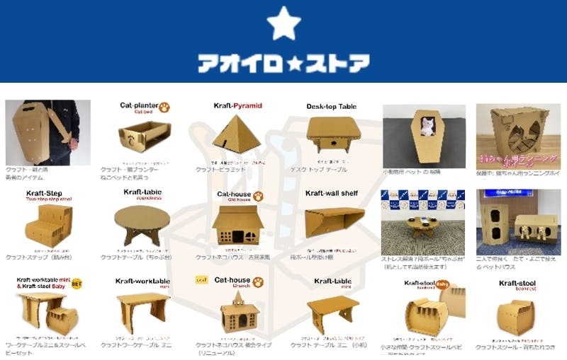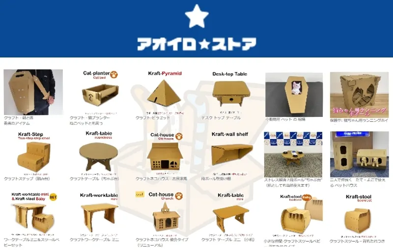 アイロップのオンラインストア「アオイロストア」では、段ボール製のネコハウスやデスクなども販売しております。アイロップの技術者が設計した工業包装のアイデアやノウハウをご家庭でもお楽しみいただけます。