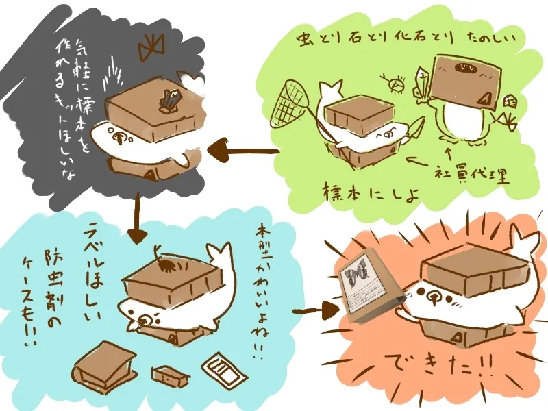 採取した昆虫、鉱物、化石などを気軽に標本にでき、