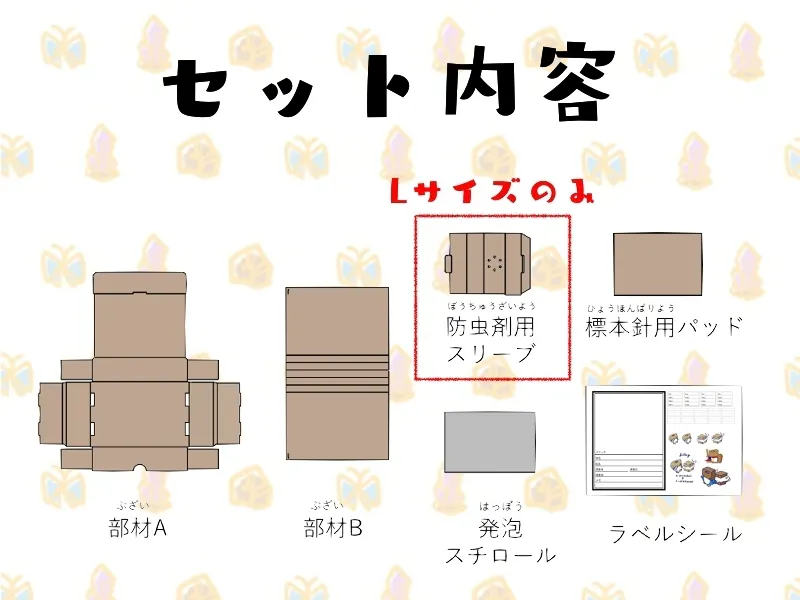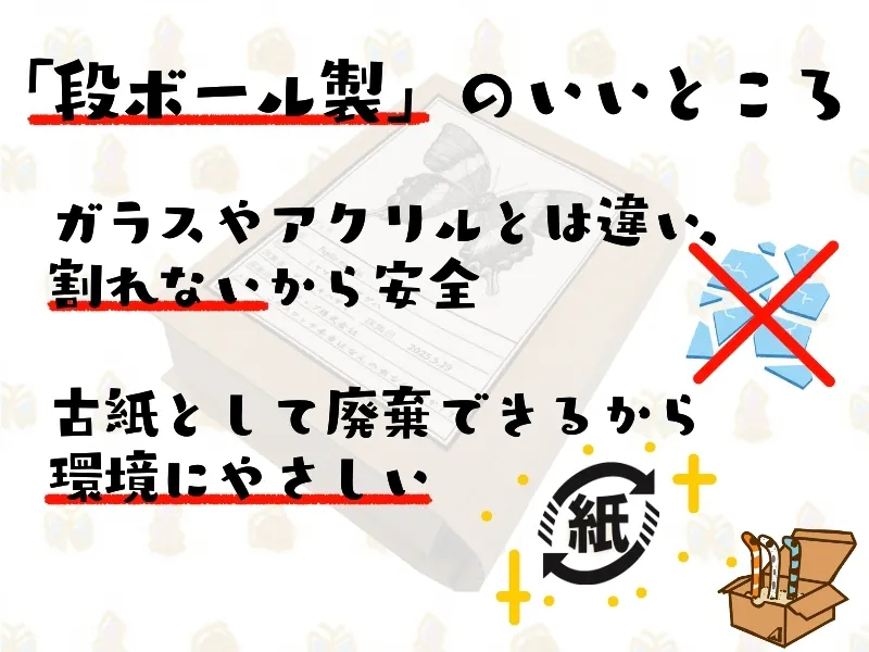 段ボール製なのでアクリルやガラス製の標本箱と違い、割れる危険がありません。