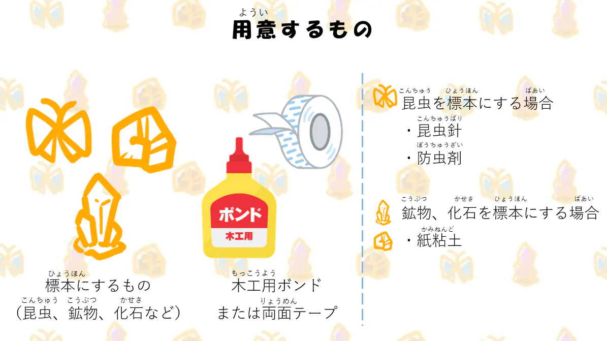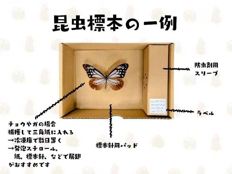 調べながら昆虫針や付属の標本針用パッド、発泡スチロールなどを使って制作することをおすすめします。