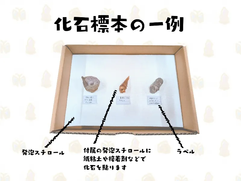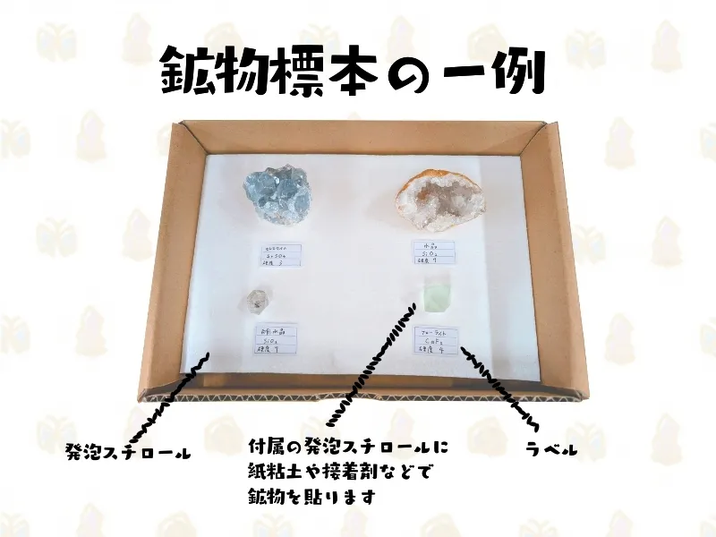 鉱物標本、化石標本は紙粘土や接着剤で発泡スチロールに固定してご使用ください。