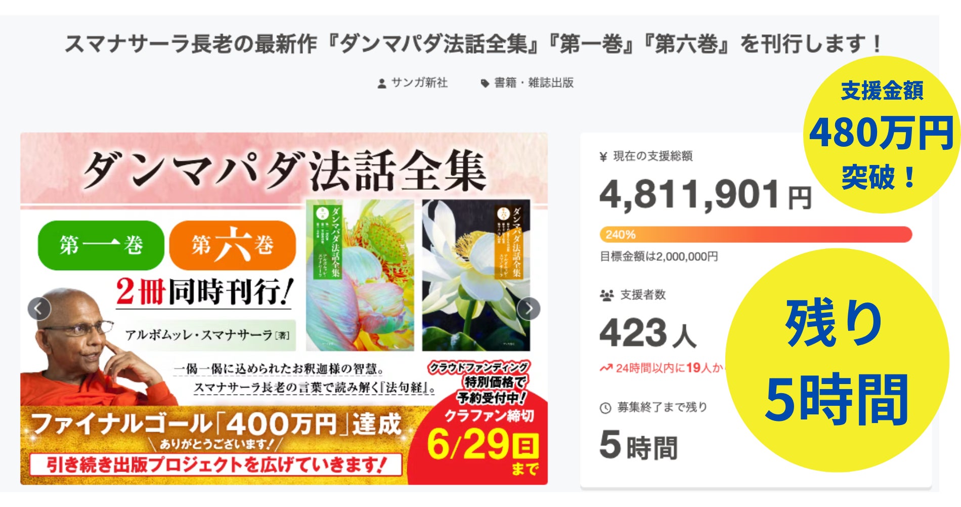 「スマナサーラ長老の最新作『ダンマパダ法話全集』『第一巻』『第六巻』を刊行します!」クラウドファンディングは、当初の目標200万円を達成後、ネクストゴール300万円、さらにファイナルゴールの400万円も突破し、現在、最後のご支援のお願いをしています。