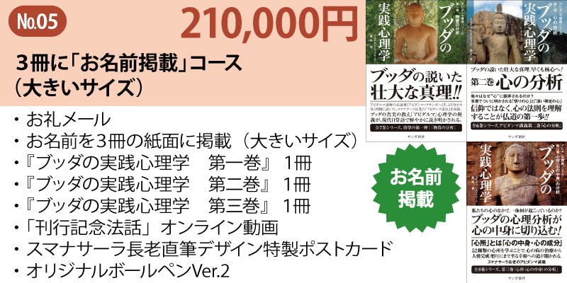 これらのコースは、3冊の書籍の紙面にお名前を掲載する特別な内容ではありますが、お名前の掲載そのものが目的なのではなく、「スマナサーラ長老のご著書刊行」というプロジェクトに深く賛同し、その成功を願う方々が選んでくださる、慈悲深いご支援のかたちだと受け止めています。