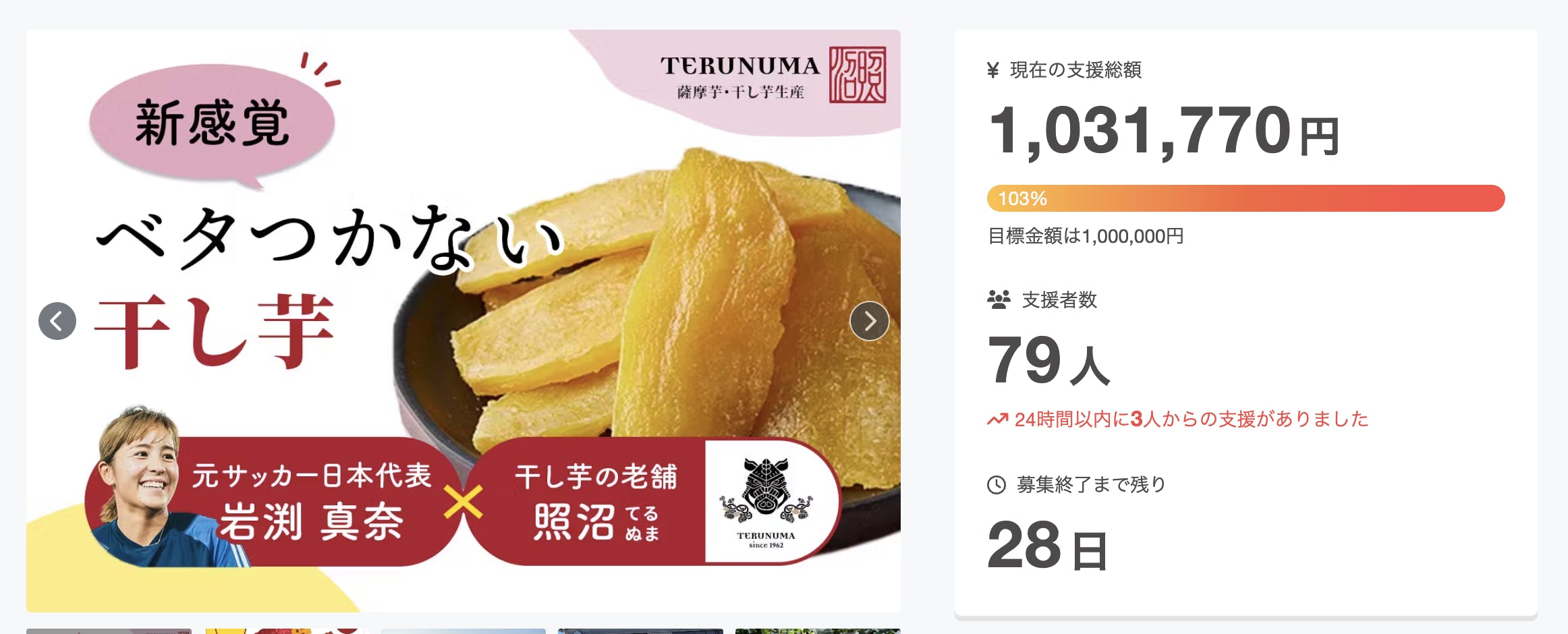 おかげさまで、多くの方に「いつでもほしいも」を手に取っていただくきっかけが生まれています。干し芋をもっと気軽に、もっと楽しく味わえる未来へ—ここからは、次なる目標「150万円」に向けて、さらに挑戦を続けていきたいと思います!