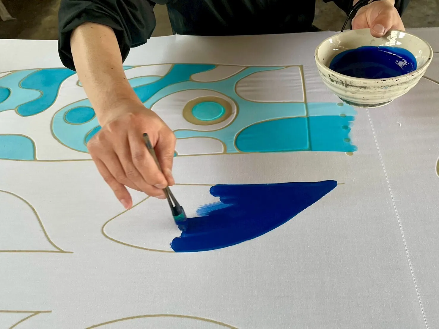 「かなめ染」の特徴は、筒引きで絵柄を描きハケで染める「手描き本染め」です。