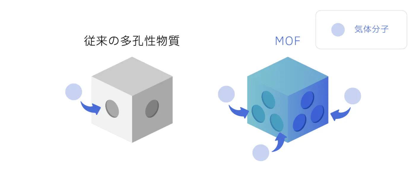 MOFには目に見えないナノサイズの孔がたくさん開いていて、より多くの物質を収納できます。 混ざりやすく拡散しやすく密度が低い、という気体も高密度かつ安全に貯蔵、運搬ができます。