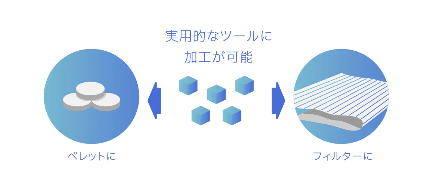 MOFは粉状の物質のため、持ち運びも簡単。さらに加工してもその機能は損なわれないため、固めてペレットにすることも、繊維を練り込んでフィルターに加工することもできます。 私たちは、粉のままでは使い道が限られるMOFを加工して、実用的な装置開発も行なっています。