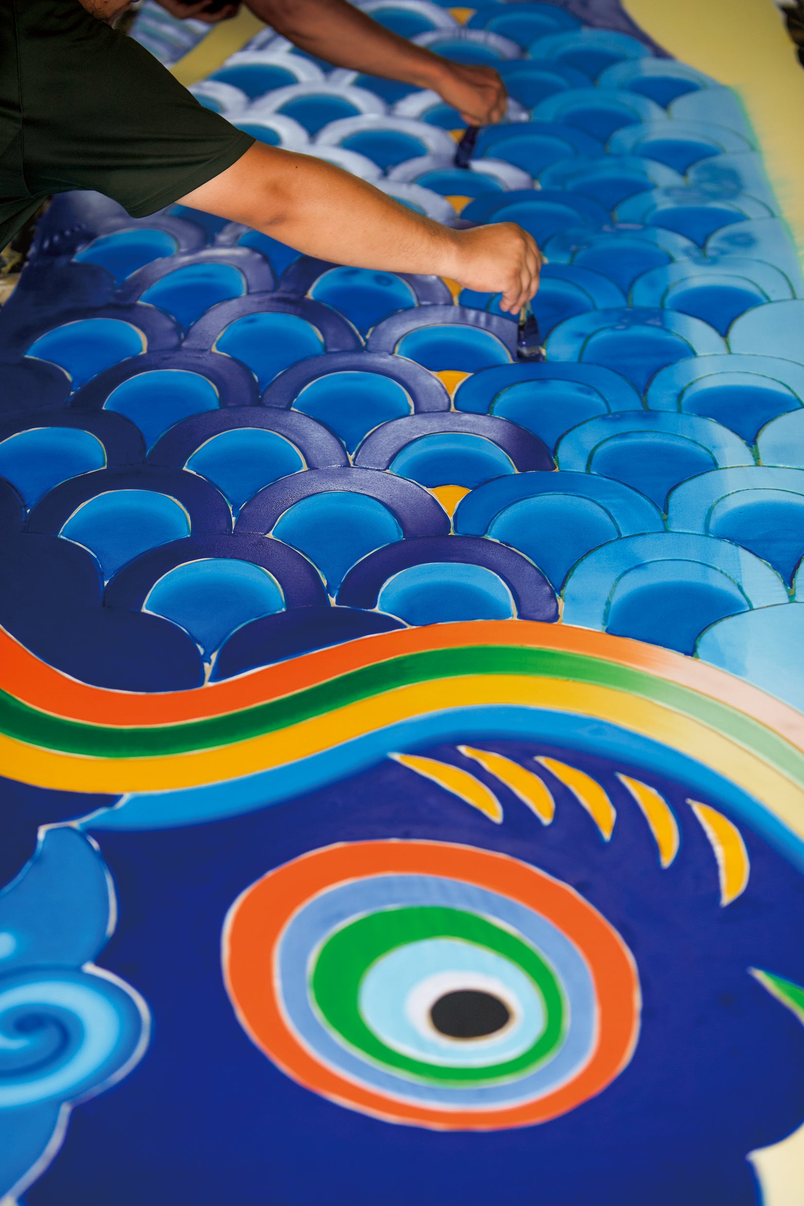 昨今の少子化や住宅事情の変化により、鯉のぼりを目にする機会が減少し、市場規模もピーク時の1/3にまで縮小。私たち鯉のぼり業界は、まさに危機的な状況に直面しています。しかし、このような時代だからこそ、職人たちは120年にわたり培ってきた染めの伝統技術を未来へと繋げたいという強い信念を持ち、日々、鯉のぼりや武者絵幟の制作に魂を込めています。
