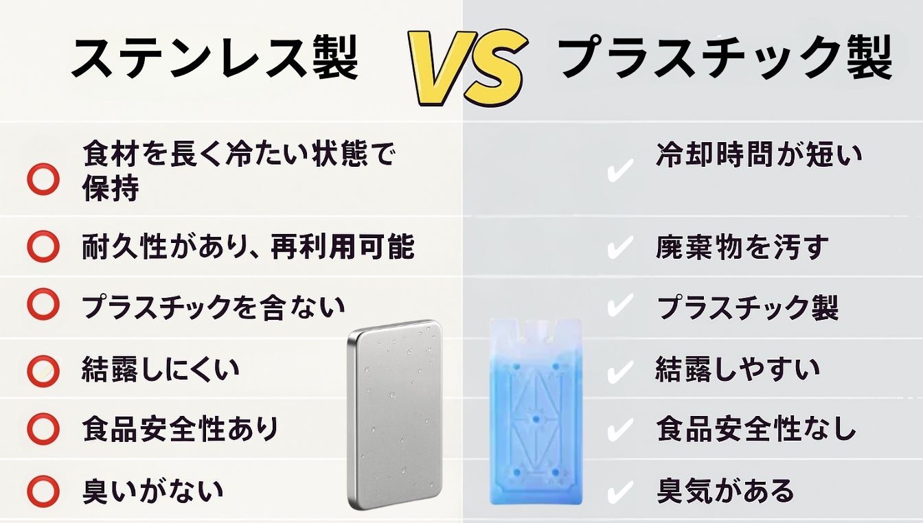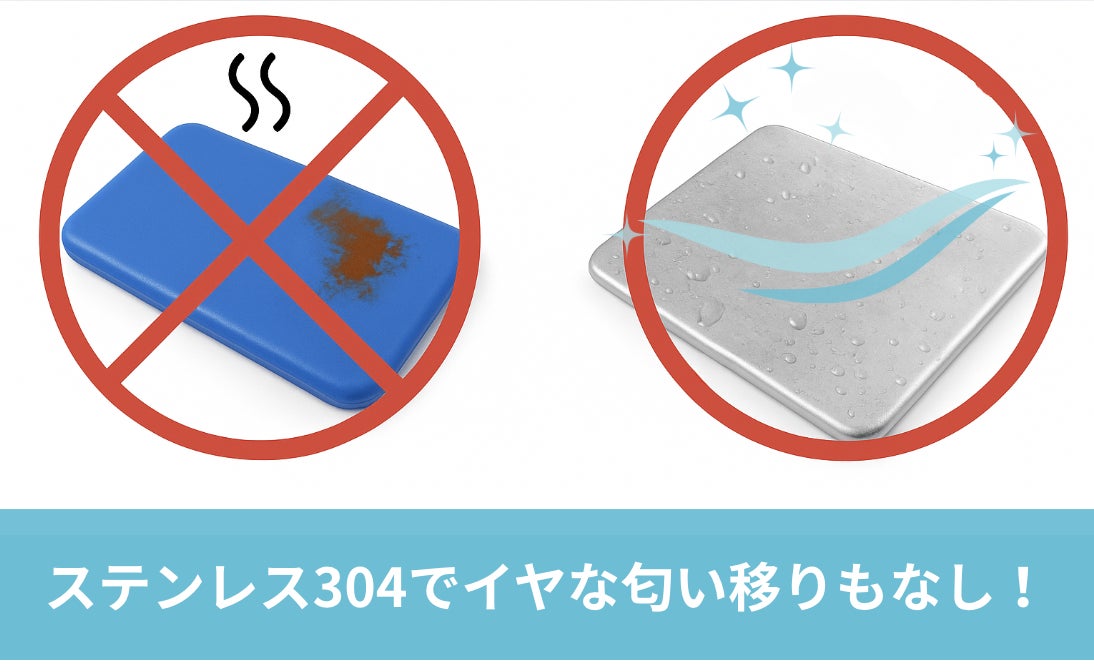 プラスチック製の保冷剤は素材にニオイや色が染み込みやすいが、ステンレスは匂いや色素を吸着しにくく清潔です。特にステンレス304は、錆びにくく汚れが付きにくいことから、メンテナンス性に優れています。