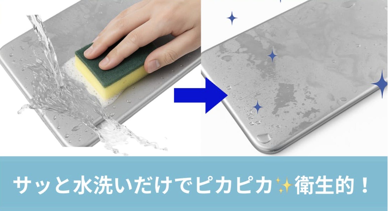 A. 表面はフラットで非多孔質のため、サッと水洗いするだけで清潔に保てます。アルコール消毒や中性洗剤の使用も可能です。
