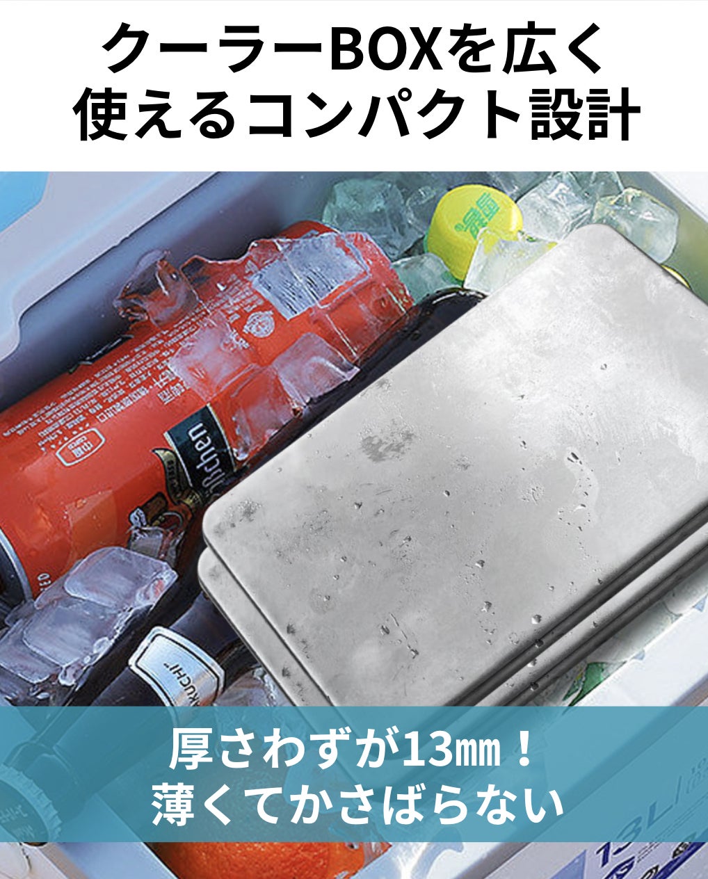 厚さわずか13mmのスリム設計。ごちゃつきがちなクーラーボックスでも、場所をとらず効率よく冷却!飲み物や食材のすき間にスッと差し込めて、スペースをムダにしません。