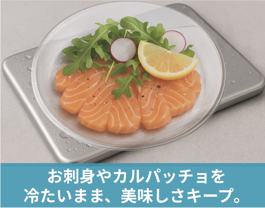 冷たいまま美味しく楽しみたいお刺身やカルパッチョ、冷たいデザートなど、Chill Plateの上なら安心。高い熱伝導性で冷たさをキープし、食材の鮮度と美味しさをしっかり守ります。