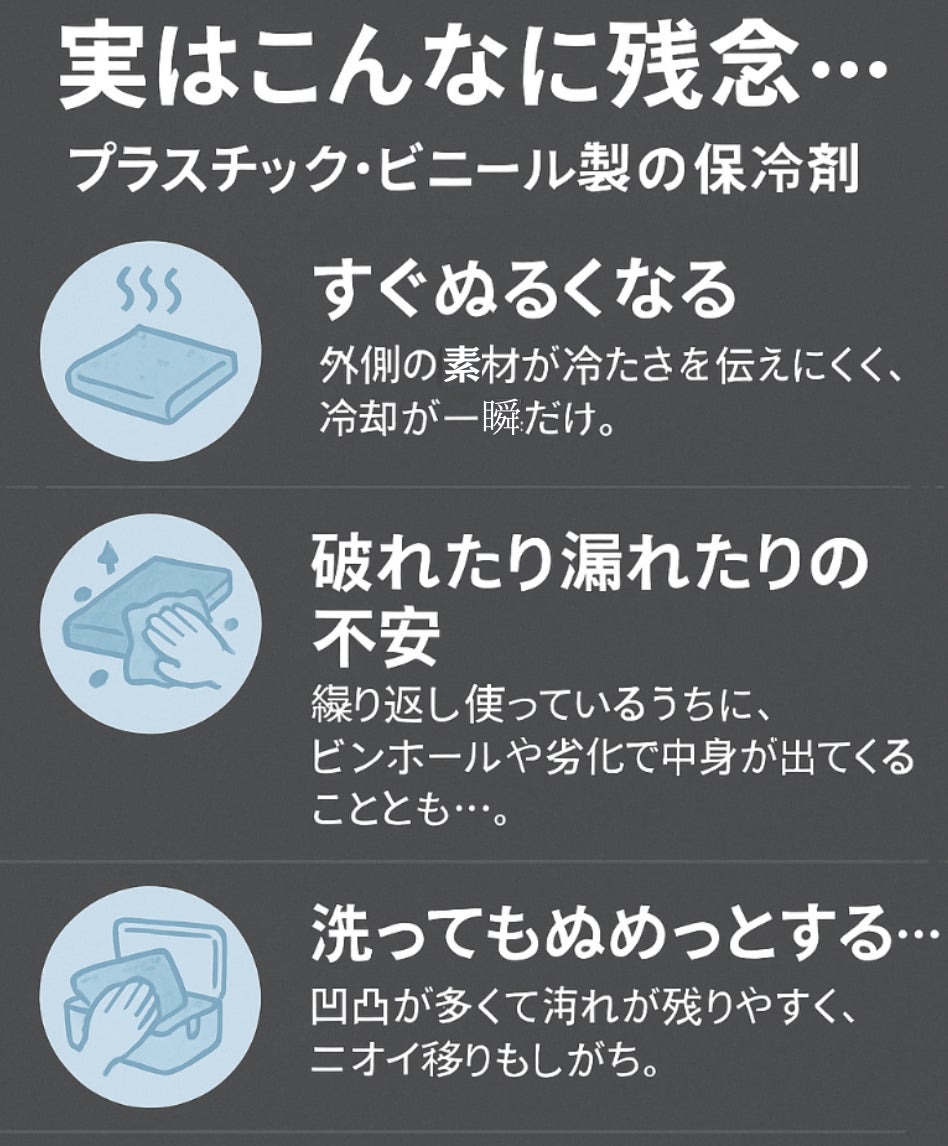 プラスチックやビニル製の保冷剤はが劣化が早く使い捨てになりやすい。さらに分解に数百年を要し、焼却処理でもCO₂を排出するため環境問題の一因となります。