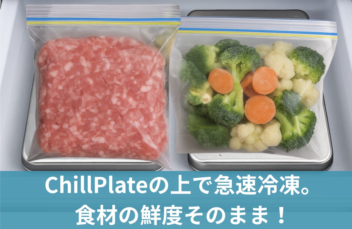 冷凍室がパンパンでも大丈夫。コンパクトなプレートタイプだから、袋詰めの食材の横にもサッと収納できます。まとめ買いや作り置きの食材を冷凍する際の急速冷凍にも活躍!