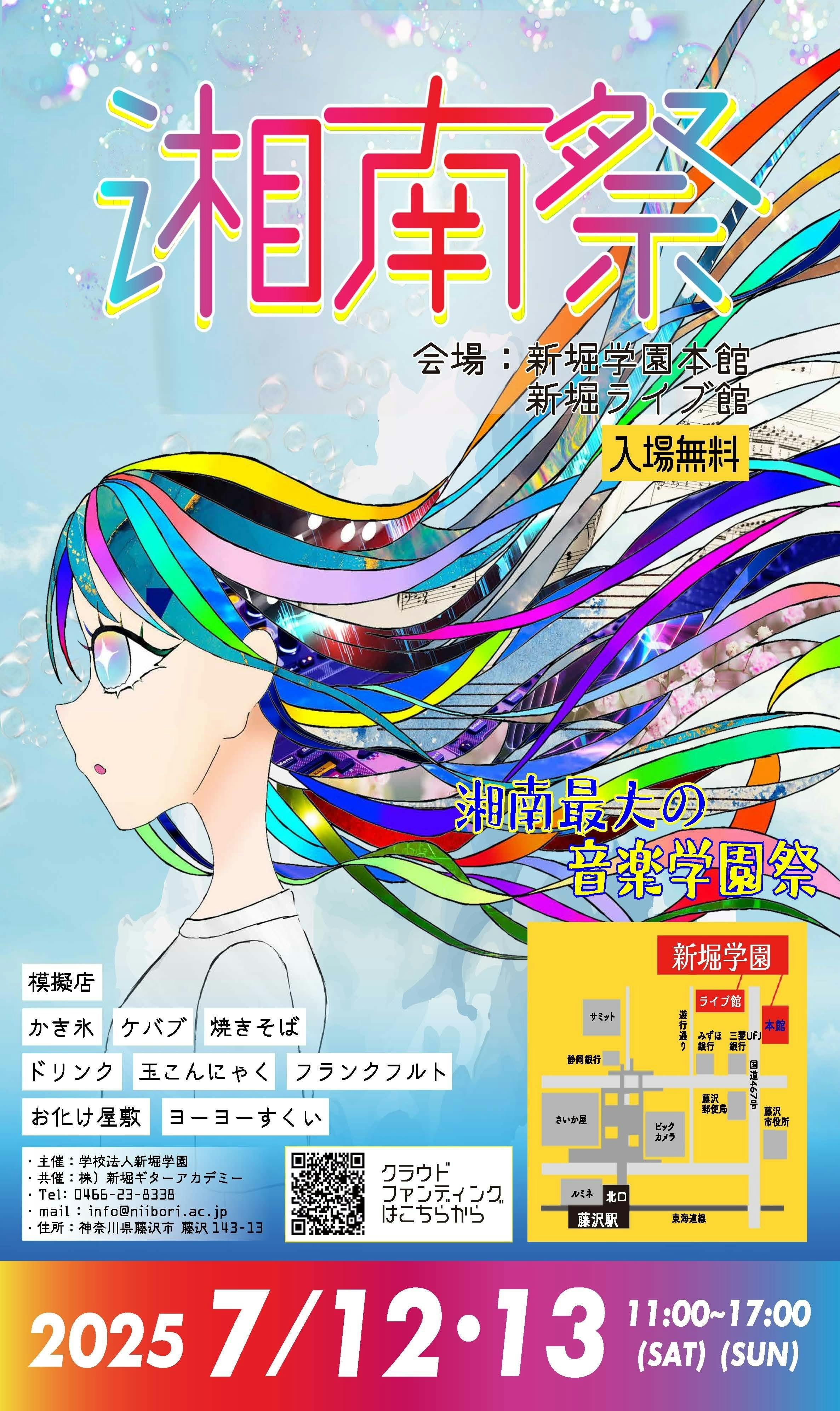 7月12(土)13(日)の2日間で行われる、新堀学園湘南祭は、模擬店はもちろん、2日間ぶっ通しのコンサート&ライブで誰もが盛り上がれる音楽学園祭となっております。