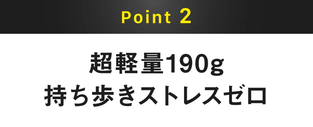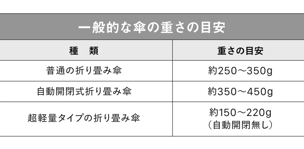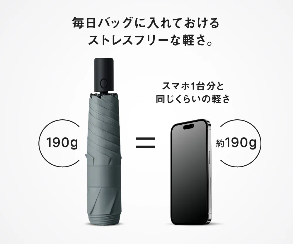 A. わずか190gです。一般的な自動開閉傘(約300g前後)より圧倒的に軽く、スマホ(約180〜210g)や文庫本1冊(約180g)とほぼ同じ。常に持ち歩いても気にならない軽さです。