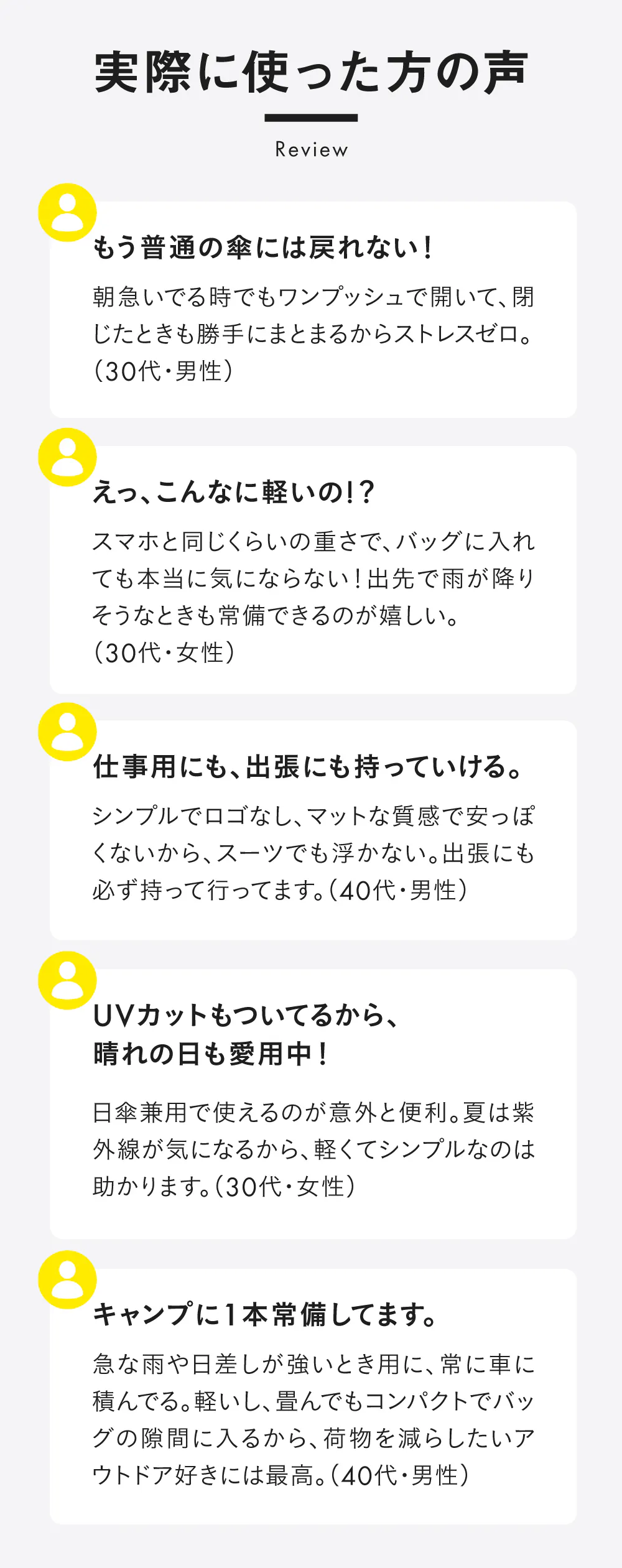 毎日バッグに入れておけるから、夏の日の突然のゲリラ豪雨にも、サッと出してパッとさせる。