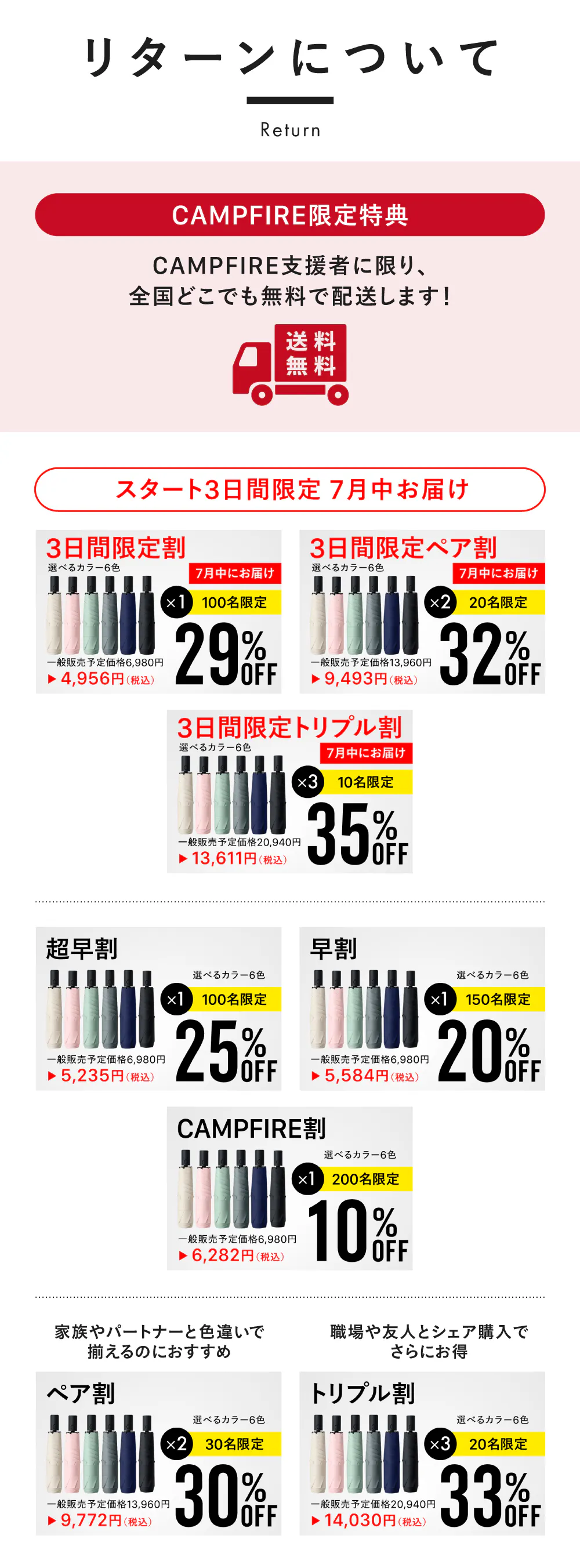 2025/08/01 20:00ご支援・応援いただいた皆さま、最後まで見守っていただいた皆さま、本当にありがとうございました!「秒傘|BYOUGASA」プロジェクトは、昨日をもちまして無事に終了いたしました。最終的に多くの方からご支援をいただき、心より感謝申し上げます。このプロジェクトを通して、「1秒で開閉できる、超軽量な折りたたみ傘」という新しい選択肢をたくさんの方に知っていただけたことを、とても嬉しく思っています。現在は、リターンのお届けに向けて最終調整を進行中です。発送時期や進捗状況については、活動報告を通じて随時ご案内してまいりますので、楽しみにお待ちいただければ幸いです。今後とも、どうぞよろしくお願いいたします!「秒傘|BYOUGASA」プロジェクト運営チーム一同 もっと見る