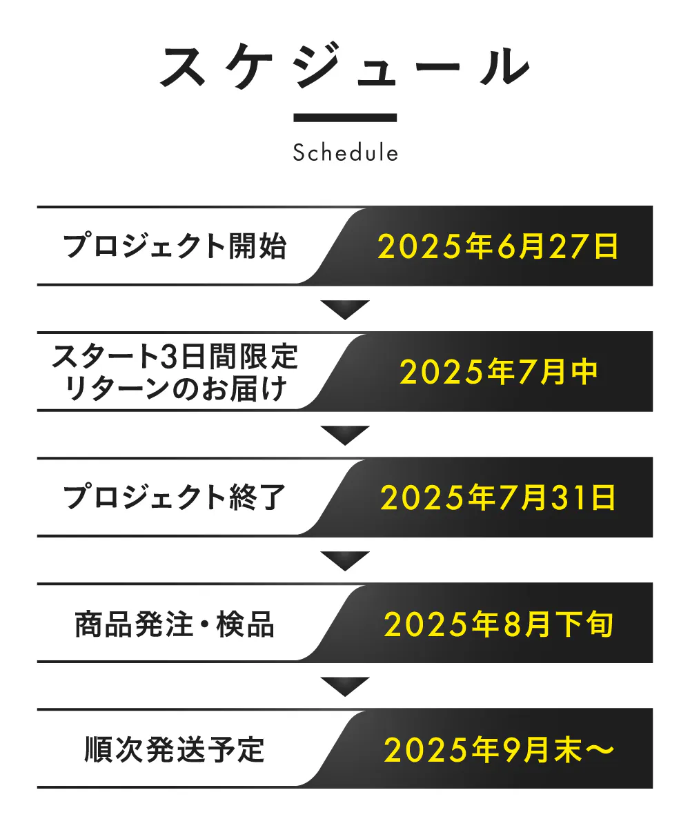 A. リターンページ記載の「お届け予定月(2025年9月)」を目安に順次発送いたします。なお、プロジェクト開始3日間限定のリターンは「お届け予定月(2025年7月)」に発送いたします。リターンの内容をよくご確認いただき、ご支援いただけますと幸いです。