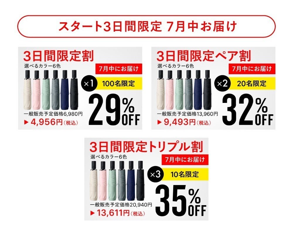 こんばんは!開始から3日間の【特別割引リターン】は本日正午をもって終了しました。初日からたくさんの方にご支援・応援をいただき、本当にありがとうございます!すでにご支援くださった皆さま、応援やシェアしてくださった皆さまにも、心から感謝しております。さらに多くの方に「秒傘|BYOUGASA」をお届けするため、まだまだ道半ばですが、夏本番のゲリラ豪雨シーズンを前に、"たくさんの方の「困った」を解決したい!"という想いで、引き続き頑張ってまいります。活動報告でも、今後も進捗やおすすめの使い方、ユーザーの声など随時ご紹介していきますので、引き続き応援よろしくお願いいたします!「秒傘|BYOUGASA」プロジェクト運営チーム一同▼プロジェクトページはこちらhttps://camp-fire.jp/projects/849016/view
