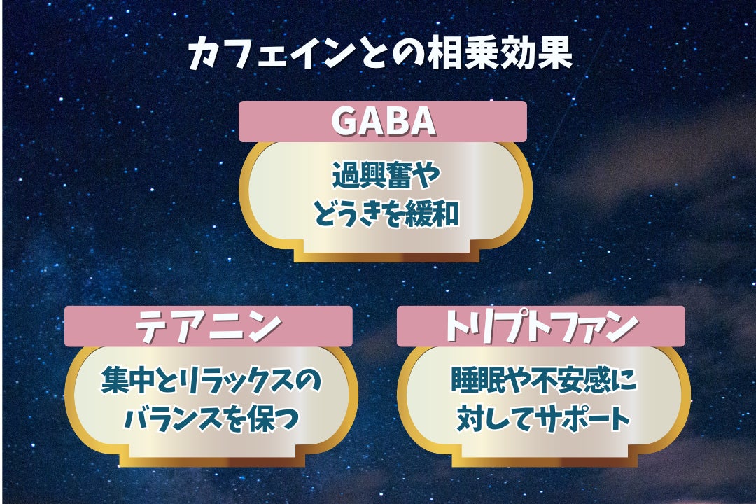 カフェインとの相性がいいGABA、L-テアニン、L-トリプトファンを配合。