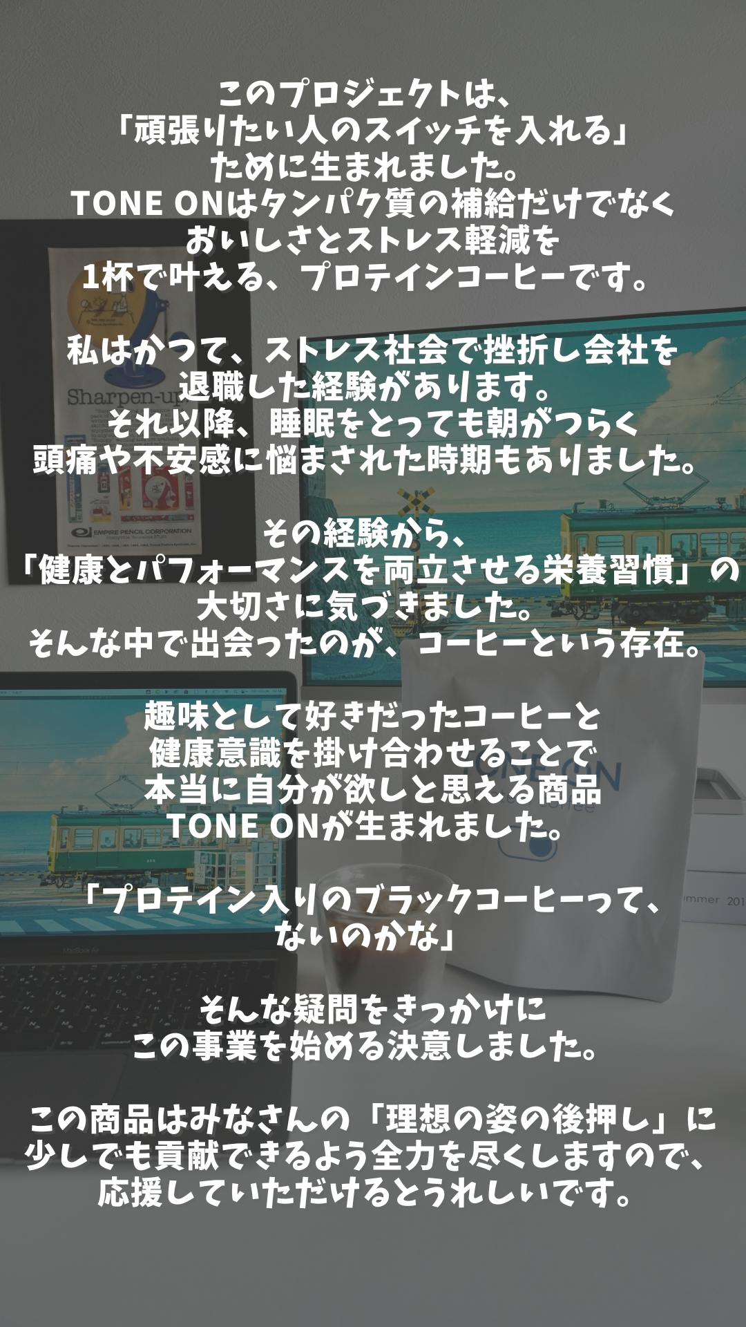 2025/10/04 21:15こんばんは!TONE ON代表の山本です。昨日、商品を発送したので明日には届くかと思います!到着まで今しばらくお待ちください!ブラックとカフェラテ、どちらの方が飲みやすかったか教えて欲しいです!改めてクラウドファンディングの支援ありがとうございました!131名もの方に支援いただき、目標達成もできて嬉しく感じると共に感動しました。自分が0から考え作ったものが誰かの目に留まり、手にとっていただける。今まで仕事をしてきて味わったことがない経験をすることができました。まだ始まったばかりですが、この気持ちは絶対に忘れずに商品を大きくしていきたいと思っています!また、みなさんとも交流できればと思い、プロテインコーヒー、中目黒で試飲会をします!ーーーーーー日程:10月12日(日)時間:12:00〜17:00場所:インスタグラム:utm_nakameguro →目黒区中目黒3-6-7 河田ビル2階ーーーーーーずっと好きなカフェで優しい店主さんにokいただけました!硬くない雰囲気にしたかったので、貸切ではなくお店も通常営業しています!既に商品は手に届いている時期ですがお話だけでもできればと思っているのでよかったら来てください!これからもよろしくお願いいたします!!! もっと見る