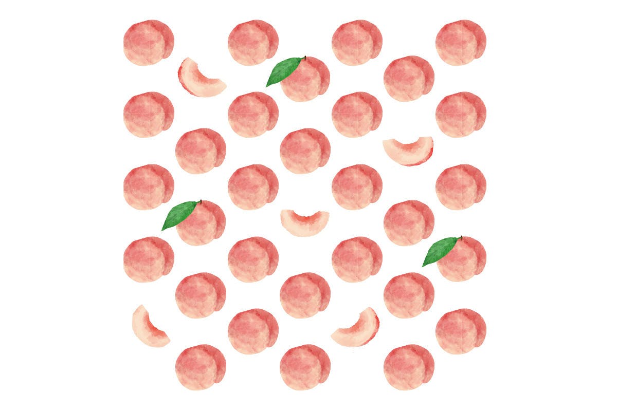 水彩風の桃のイラストの中にランダムで葉のついた桃、くし形切りの桃を配置し、これでもかと桃が伝わるように配置しました。遠くから見ても、即座に桃だと伝わるといいなと思っております。