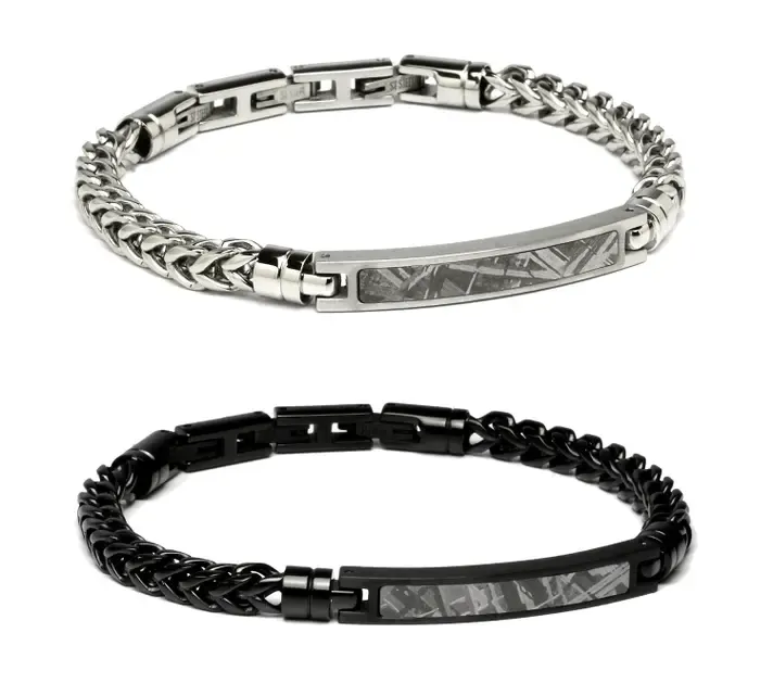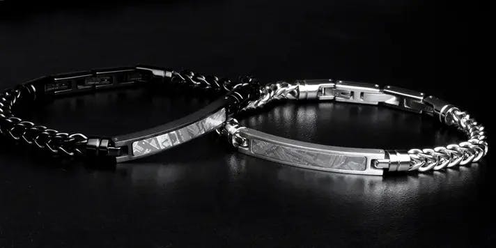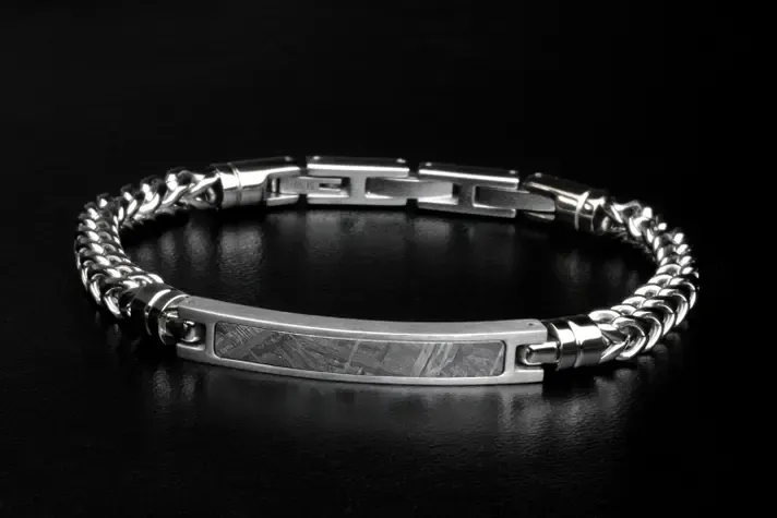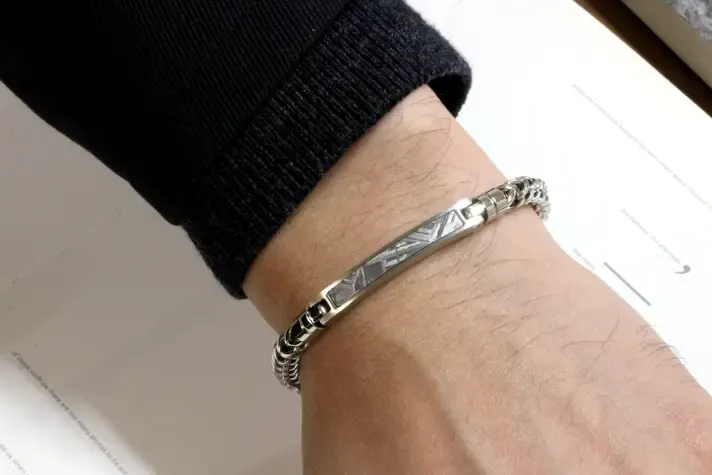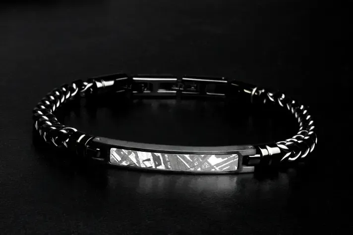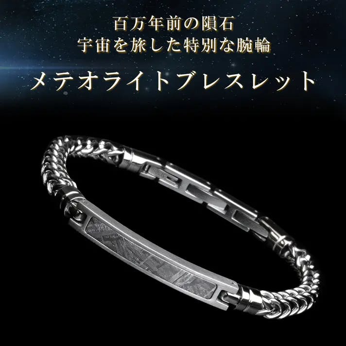 宇宙から飛来したメテオライト(隕石)を使用したブレスレット。神秘的な模様を浮かび上がらせるメテオライトは、100万年の時が刻まれた美を放ちます。その美しさは、まるで小宇宙が手元にあるかのような魅力溢れる逸品です。