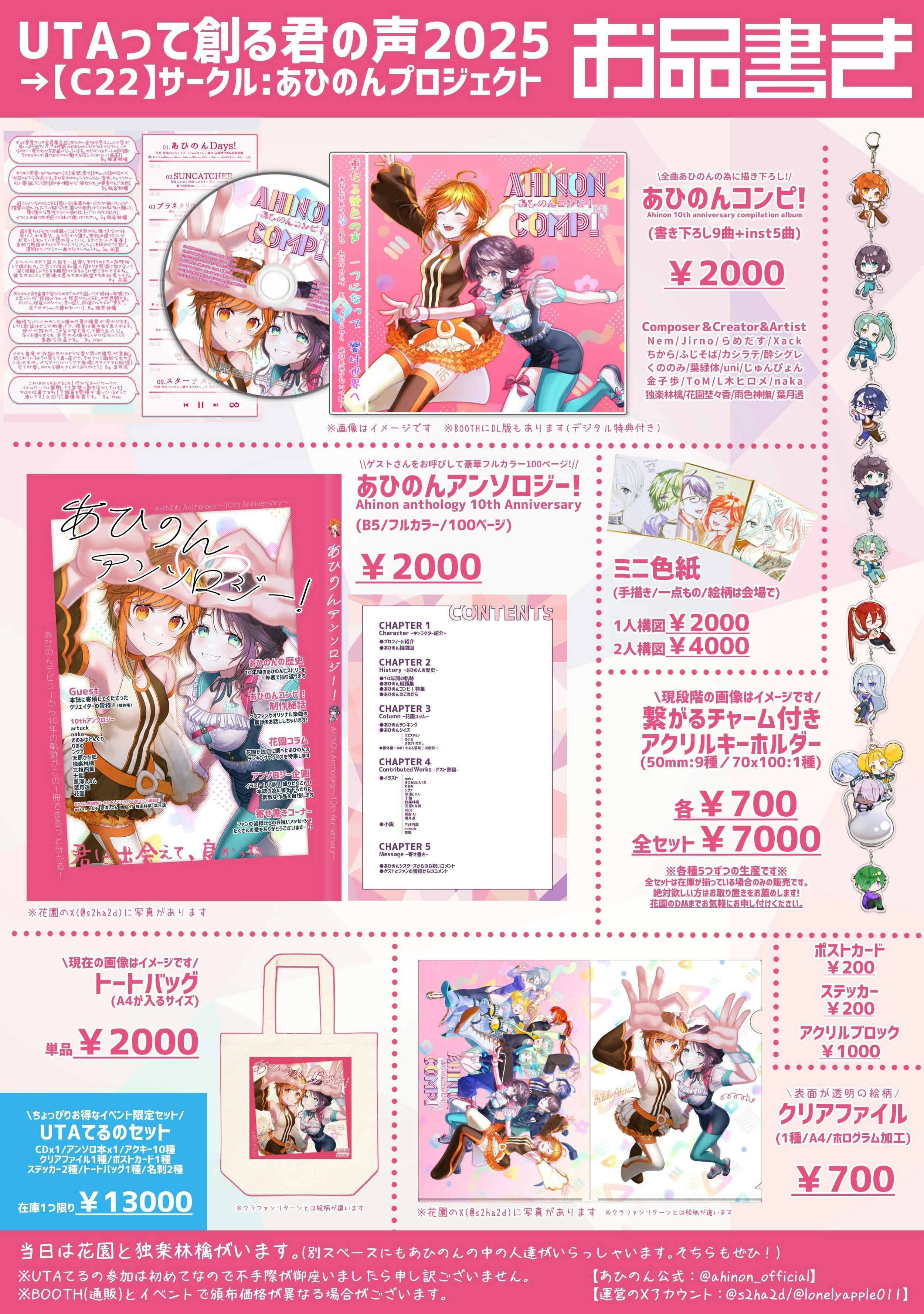 こんにちは!「あひのんプロジェクト」運営です。8月23日、UTAUオンリーイベント「UTAって創る君の声」にてあひのんプロジェクトがスペースC22へ出店します!今回は当サークルの頒布物の内容と、他サークル様のあひのん関連の頒布物をご紹介します!あひのんコンピ!(2000円)本プロジェクトで制作を目標としていたコンピCDです!以下で全曲の試聴が可能です。渾身のオリジナル曲9曲に心を鷲掴みにされてください! あひのんアンソロジー!(2000円)あひのん10周年を記念し、たくさんの方々によって寄稿を受けたアンソロジーです!キャラクター紹介やあひのんのこれまでの歴史、ファンの方々からのコメントを集めた寄せ書きなど、これまでのあひのんを一気に知ることができる結構分厚い本ですよ!繋がるチャーム付きアクリルキーホルダー(各700円、全10種)あひのん全員をそれぞれソロでアクキー化しました!可愛らしい繋がるアクキーです!UTAてるのでは他にも繋がるアクキーを頒布しているサークル様がと書こうとしたのですが現時点で出ているお品書きを見る限りうちだけなのかもしれません……あひのんプロジェクト公式から全員分のソロのアクリルキーホルダーが出るのは今回が最初で最後だという噂です。ぜひとも複数個買って繋げて撮影してください!トートバッグ(2000円)あひのんアンソロジー!表紙デザインのトートバッグです!クラファンのグッズプランの内容とはまた違うデザインになっています。A4が入るサイズですので、UTAてるの当日に得た戦利品を入れるのに使えますよ!クリアファイル(700円)オモテにはあひのんアンソロジー!表紙デザイン、ウラにはあひのんコンピ!キービジュアルが描かれたクリアファイルです!標準的なA4サイズで、オモテ面は背景が透明&ホログラム加工でキラキラになっていますよ!何気なく公開されていますが、あひのんアンソロジー!表紙のあひるとののんが切り取られることなく全身写っているグッズ、実は珍しいかもしれません。その他、アンソロジー表紙デザインのポストカードや以前からBooth等にて頒布されているグッズも並ぶ予定です。ポストカード(200円)ステッカー(200円)アクリルブロック(1000円)また、会場限定でちょっぴりお得なセットもご用意しております!どれくらいお得かと言いますと、純粋に1個ずつ買ったら14300円くらいになる内容が13000円になっています。UTAてるののあひのんを全て得たい!という欲張りさんにオススメです!以下、他サークル様から頒布されるあひのん関連グッズもご紹介します!スペース番号順に並べておりますので、当日会場を訪れた際にも参考にしてください!(新たに公開され次第、順次更新していきます!)A17「うぇるだうん」様赤馬凛翔の音声提供者、アルパカ肉さん主催のサークルです。あひのんメンバー10人で1セットのフレークシールが頒布されます。「うぇるだうん」様お品書きB9「玉響円形劇場」様(委託)箸々様によるSDイラスト本「ウタイロアソート」にて、玖婥えれんのイラストが収録されています。「ウタイロアソート」お品書きB19「ココロネラボラトリィ」様玖婥えりんの音声提供者、天原ひな狐さん主催のサークルです。クラファンのリターン限定音源として収録された玖婥えりん-prototype-向けの立ち絵のデザインのアクリルスタンドが頒布されます。「ココロネラボラトリィ」様お品書きC14「歌学反応式」様以前から頒布されている「UTAUマンションクリアファイル」のF棟に、響姫ひるや・音暖のーと・玖婥えれんが住んでおります。「歌学反応式」様お品書きD5「きのみはどんぐり」様以前から頒布されているUTAU音源大集合トートバッグに、響姫あひるが参加しております。「きのみはどんぐり」様お品書き他にもあひのんメンバーが参戦しているサークル様があれば、随時情報をお寄せください!運営メンバーが全力で購入に伺います。また、UTAてるのにはあひのんの音声提供者やあひのんコンピ!制作関係者の方々もサークル参加していらっしゃいます。A9-10 雨色神撫さん(売り子)(あひのんコンピ!マスタリング担当者)A17 アルパカ肉さん(赤馬凛翔音声提供者)A19-20 餅路チオさん、犬狸はに兎さん(PRISMオリジナル曲「SUNCATCHER」イラスト・MV担当者)B3 雨降川ひばりさん(PRISM&M×LORDオリジナル曲「可愛い可愛い探偵さん」MV担当者)B9 らめだすさん(PRISMオリジナル曲「SUNCATCHER」作詞担当者)B19 天原ひな狐さん(玖婥えりん音声提供者)UTAてるのでは他にもたくさんのサークル様が出店されますよ!ぜひ公式サイトや各サークル様のお品書きなどを眺めて、そして会場へ足を運んでみてくださいね。「UTAって創る君の声」公式サイトXでの「#UTAてるの2025」検索結果リンクXでの「#UTAてるのお品書き」検索結果リンクところで……ストレッチゴールを達成していないのにCD化を果たしたの?と疑問に思われた方はいらっしゃいますか?これについては……なんと!!!普通に、運営のポケットマネーで実現しています!収支報告を後日詳細に行うため記録と計算を進