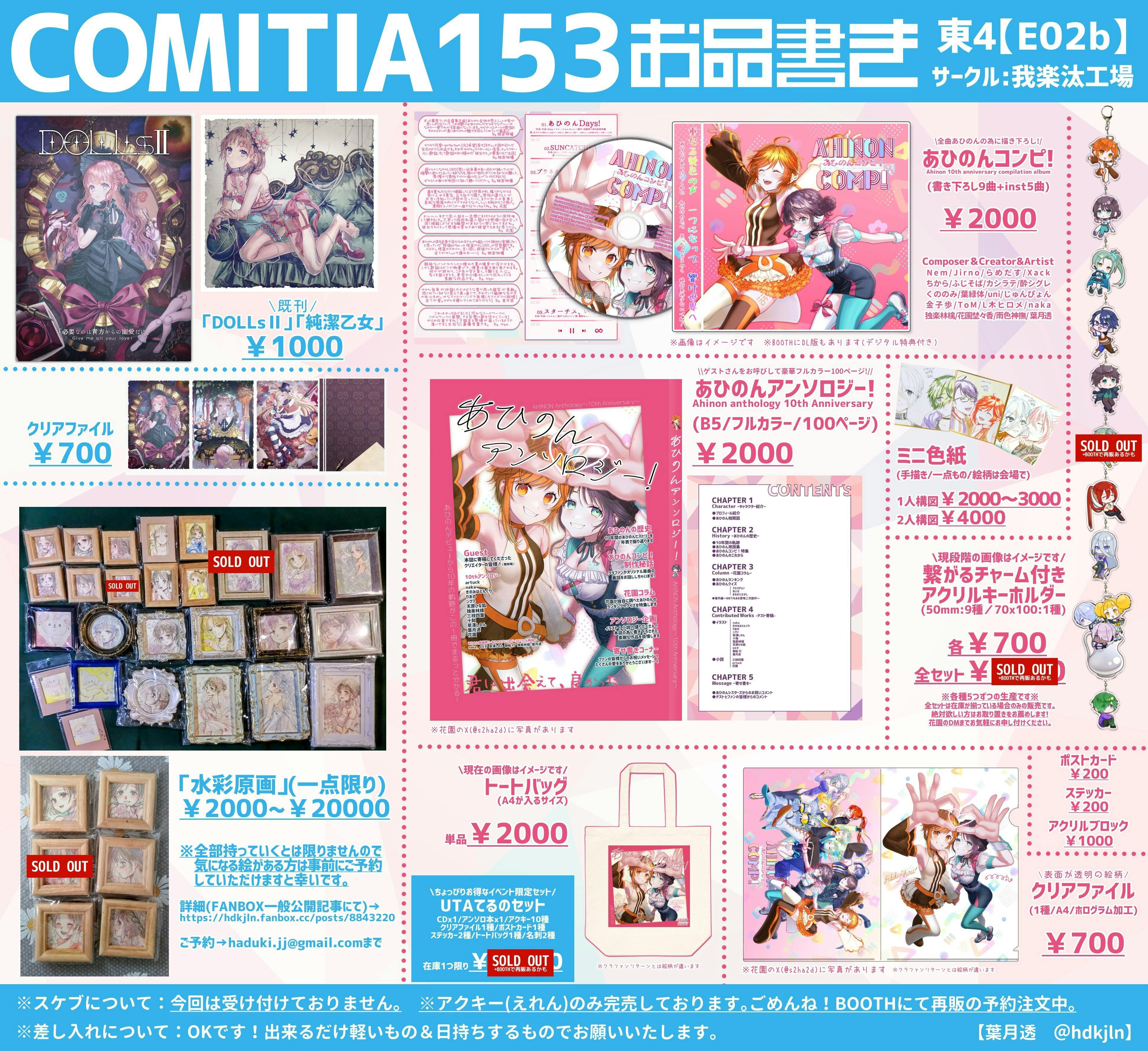 こんにちは!「あひのんプロジェクト」運営です。先日8月23日のUTAUオンリーイベント「UTAって創る君の声」では、たくさんの方々にあひのんスペースを訪れていただきありがとうございました!平素よりお世話になっている方々がご挨拶に来てくださったり、身分を明かさずにコンピとアンソロをススッと買っていかれる方もいらっしゃったり……普段は感じることのない、しかし画面の向こうでその存在を認識していた、UTAUユーザーの世界を生で感じることができたイベントでした!てるのや通販でのコンピの売上などは、後日まとめて収支報告させていただきます。今回の頒布物は基本全てBoothよりお求めいただけますよ!てるのに参戦できなかったという方や、参加したけれど買い逃してしまったという方も、下記リンクよりお買い求めください!Booth「我楽汰倉庫」のリンクそして……!イラストレーター葉月透先生のサークル「我楽汰工場」がCOMITIA153に参加します!葉月透先生によるCOMITIA153告知ポストコミティアでも「あひのんコンピ!」「あひのんアンソロジー!」を含むあひのん関連のグッズが頒布されます。現地に行かれる方は是非足を運んでみてくださいね!今後もこの活動報告ページやあひのん公式Xアカウントにて情報を発信してまいります!お楽しみに(^^♪あひのん公式Xアカウントのリンクあひのんコンピ!特設サイトのリンク