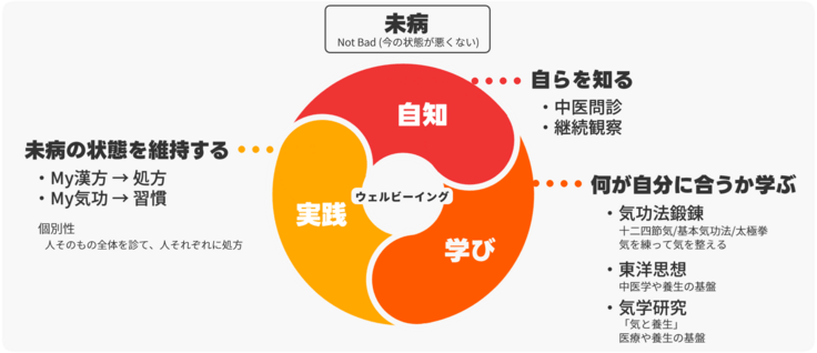 「Not Bad(悪くない)」と感じられる状態を維持すること。これが日々の幸福感や安心感につながる、つまりウェルビーイングだと私たちは考えています。 そのためには、東洋医学で重視される「養生」という視点が必要です。養生とは、自分に合った方法で心身を整え、日々の生活の中で無理なく継続することです。