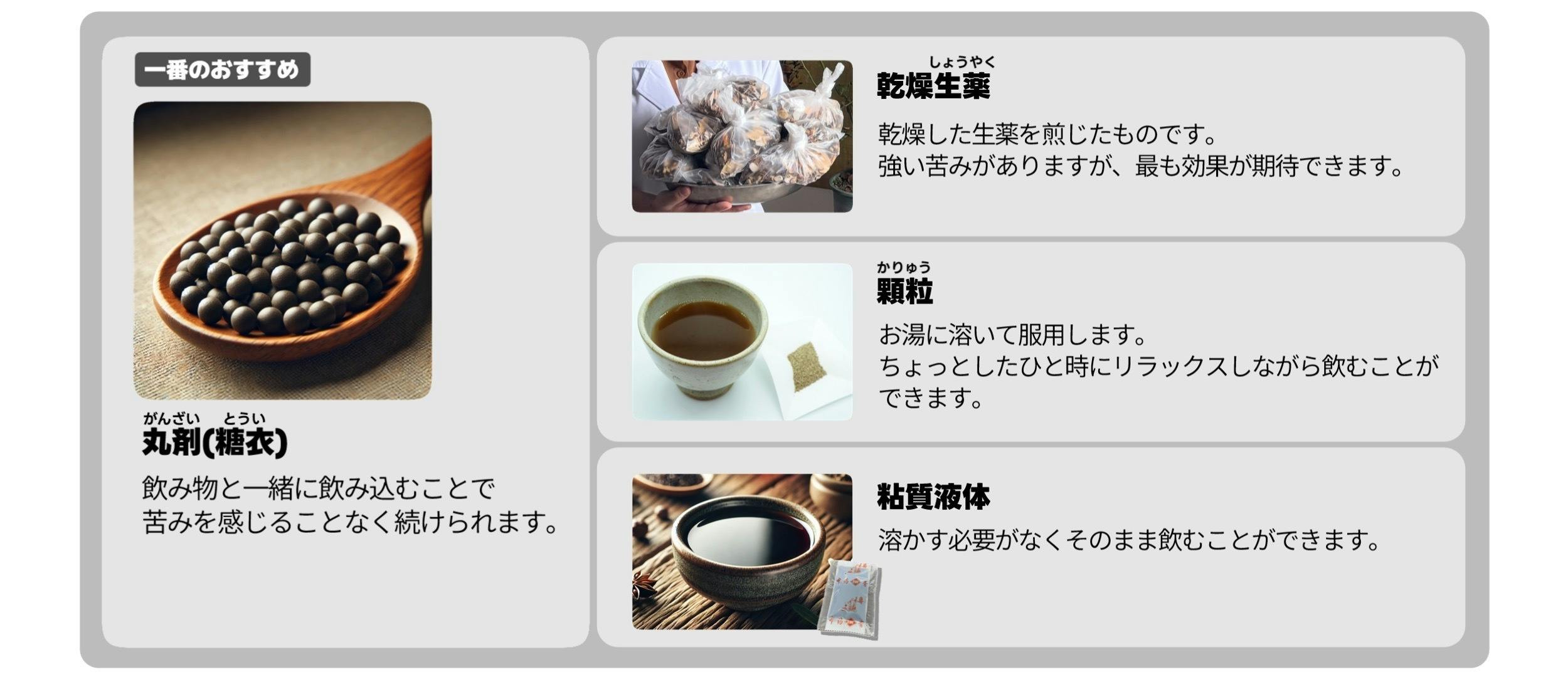 丸剤・乾燥生薬・顆粒・粘質液体の4つの摂取方法があります。