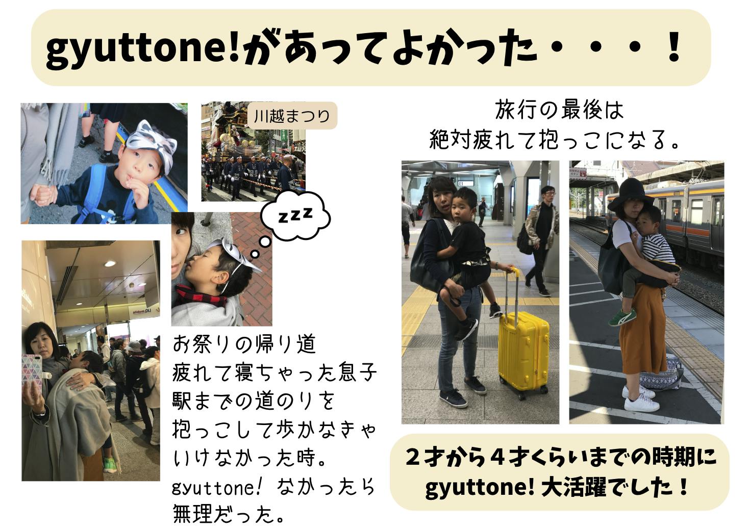 子どもとのお出かけは不測の事態の連続。何かあっても、gyuttone! があれば、対応できるという安心感があったので、私は子どもとのお出かけに積極的になれました。