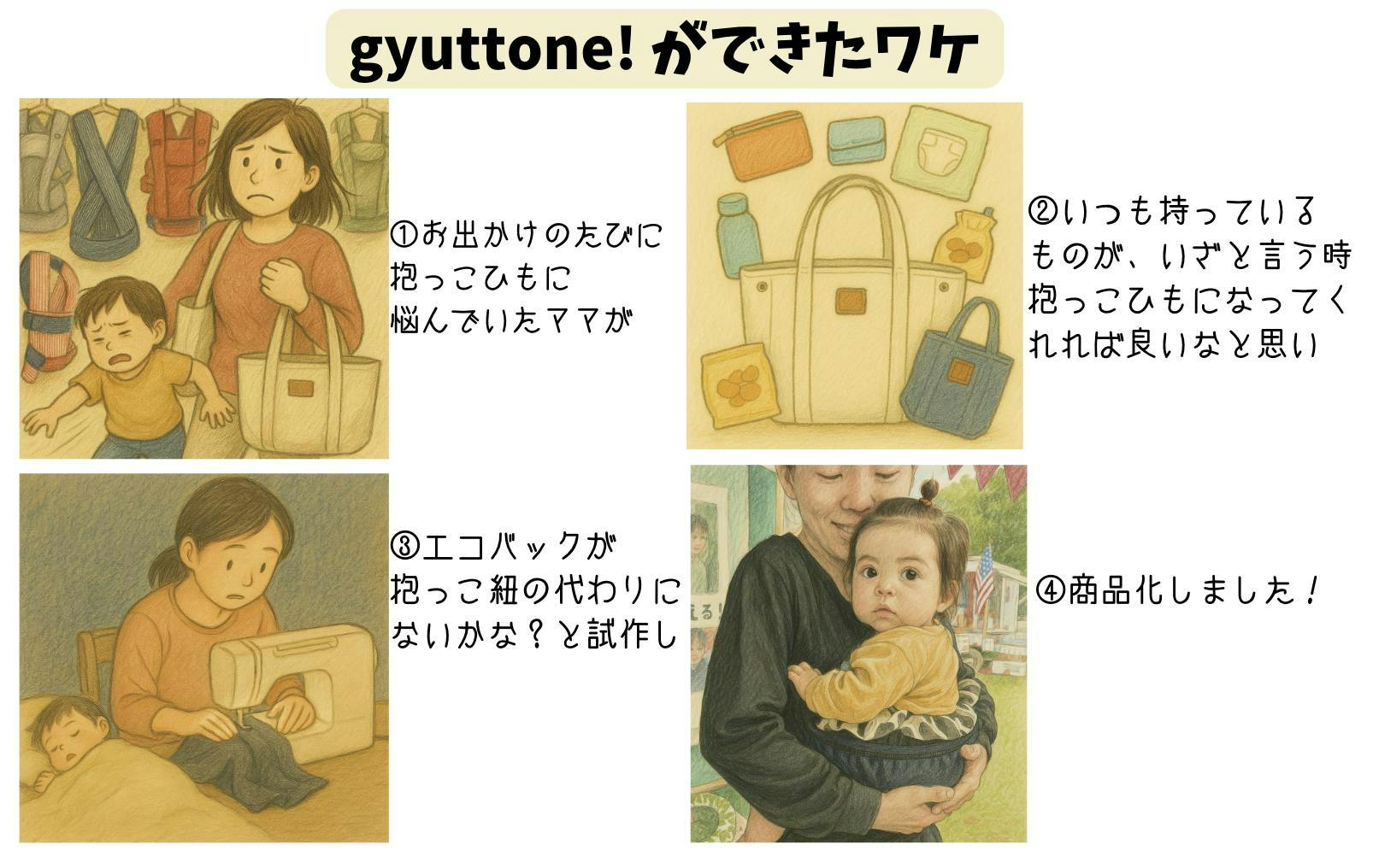 gyuttone! は、私がシングルマザー時代に作った商品です。既存の抱っこ紐の問題点を解決し、孤独なひとり親の子育てを支えたい!と思っていました。