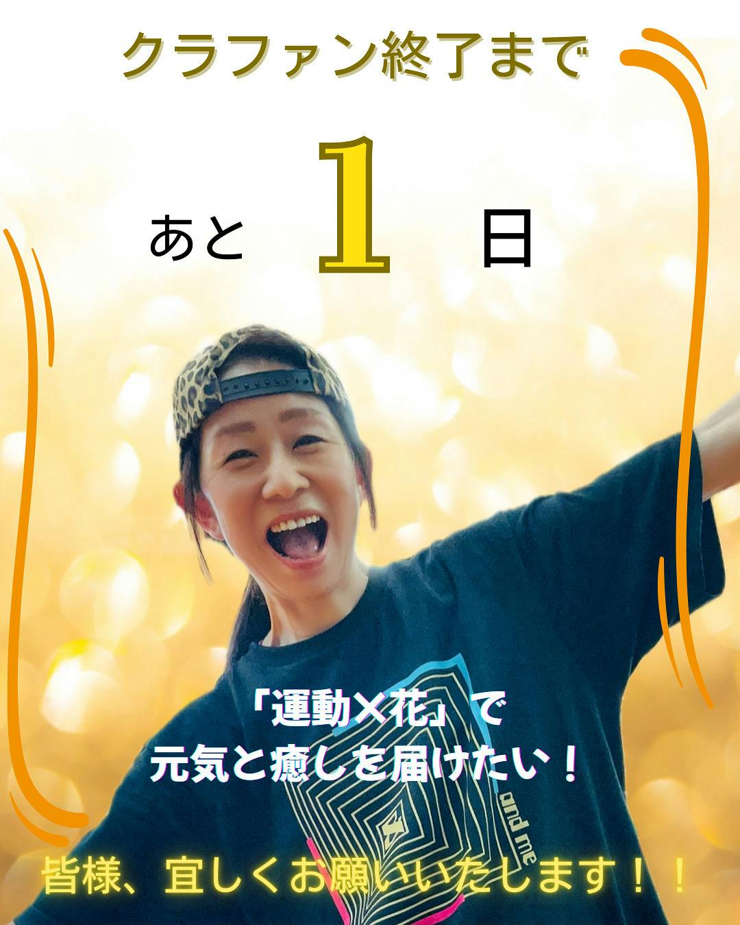 2025/08/30 10:08【クラファン終了まであと1日!】クラファンスタートの時に載せたこの写真、誰もいないところで全力笑顔で撮りました。「運動×花」で元気と癒しを届けたいという想いから今回挑戦することを決意しました。そしてクラウドファンディングがスタート。「さあ!いくぞ!!」未知の世界に飛び込む、バンジージャンプを飛ぶような気持ちで挑みました。毎日しつこいくらいにメッセージも送らせていただきました。想いを読んで、共感、ご支援下さった皆様、本当にありがとうございます。皆様のお陰で現在91%、あと45,000円で目標達成のところまで来ています。明日いよいよ最終日を迎えます。ゴールまで見届けていただきたいです!クラファンページを是非ご覧ください!皆様、最後の応援、ご支援をどうか宜しくお願いいたします! もっと見る