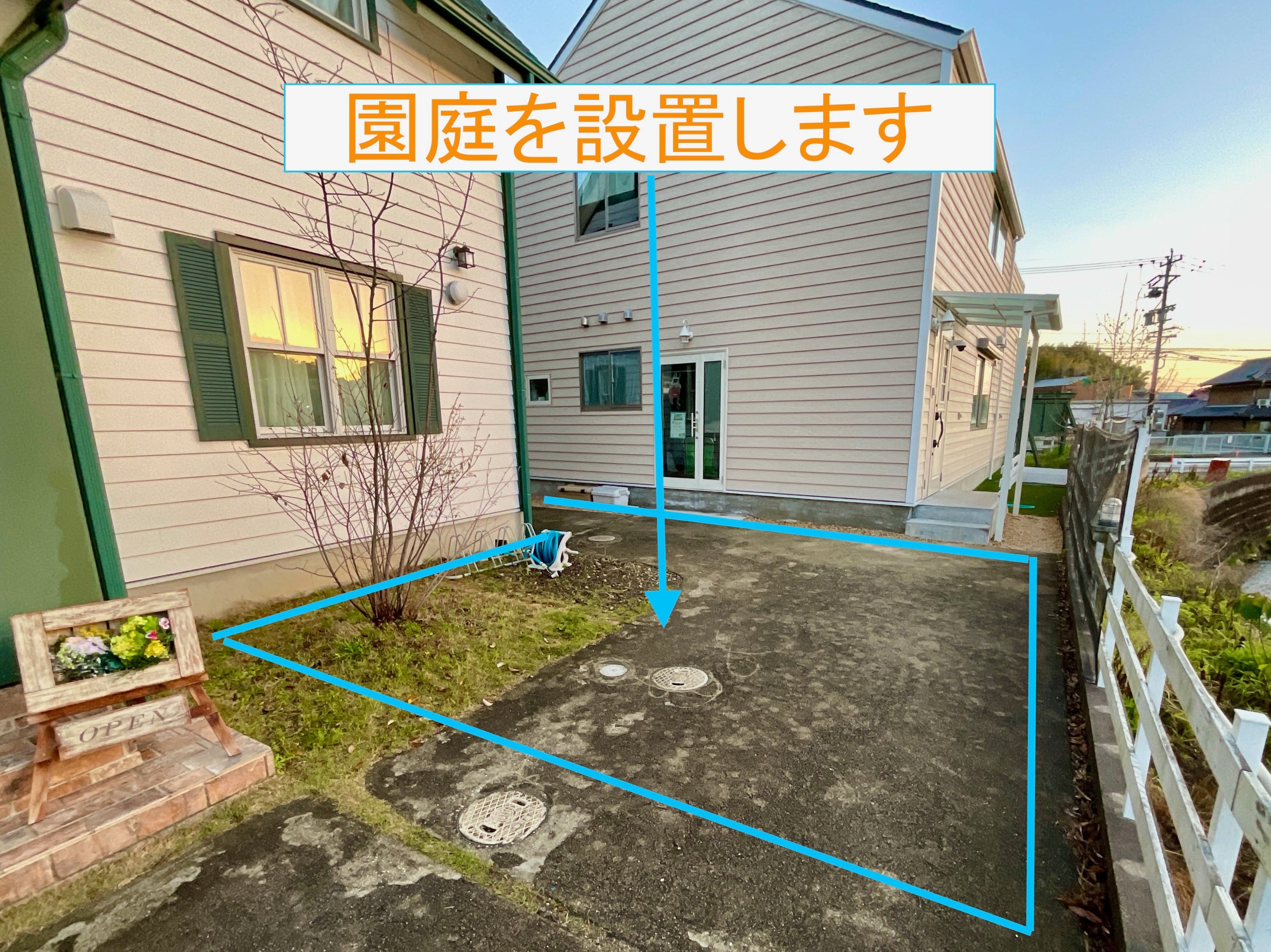 元々、美容室の付帯施設としての保育園のため、園庭などが手狭です。受け入れ枠の拡大のためには、保育士の負担軽減と園児のストレス低減のため、園庭の拡張を行う必要があります。美容室の余剰地を活用して、人工芝と安全策と遊具を充実させます。