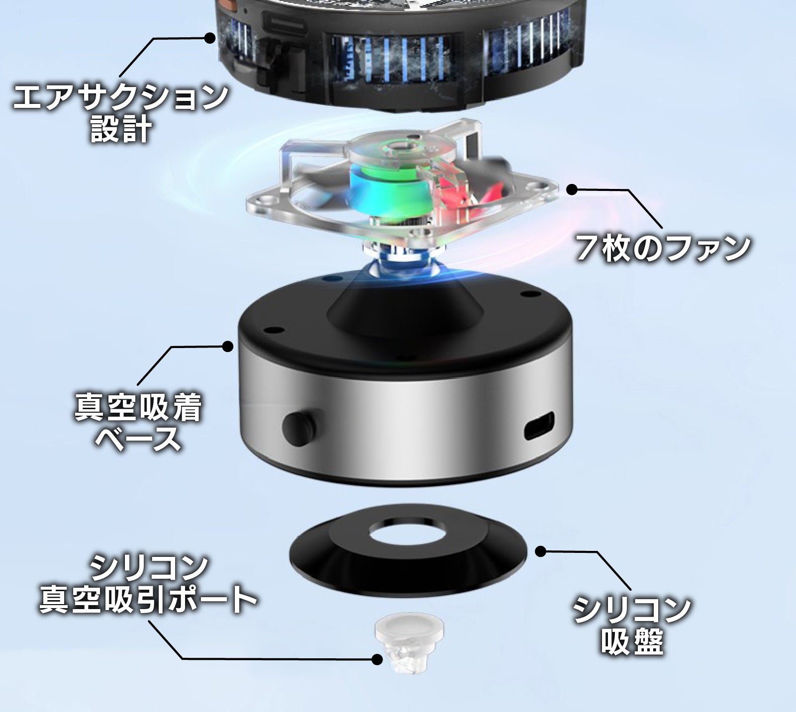 【冷却スマホホルダー】のケース内の7枚のファンが高速回転して真空度65kPaの吸着力を作り出し、最大で5kgもの強力な保持力を発揮。