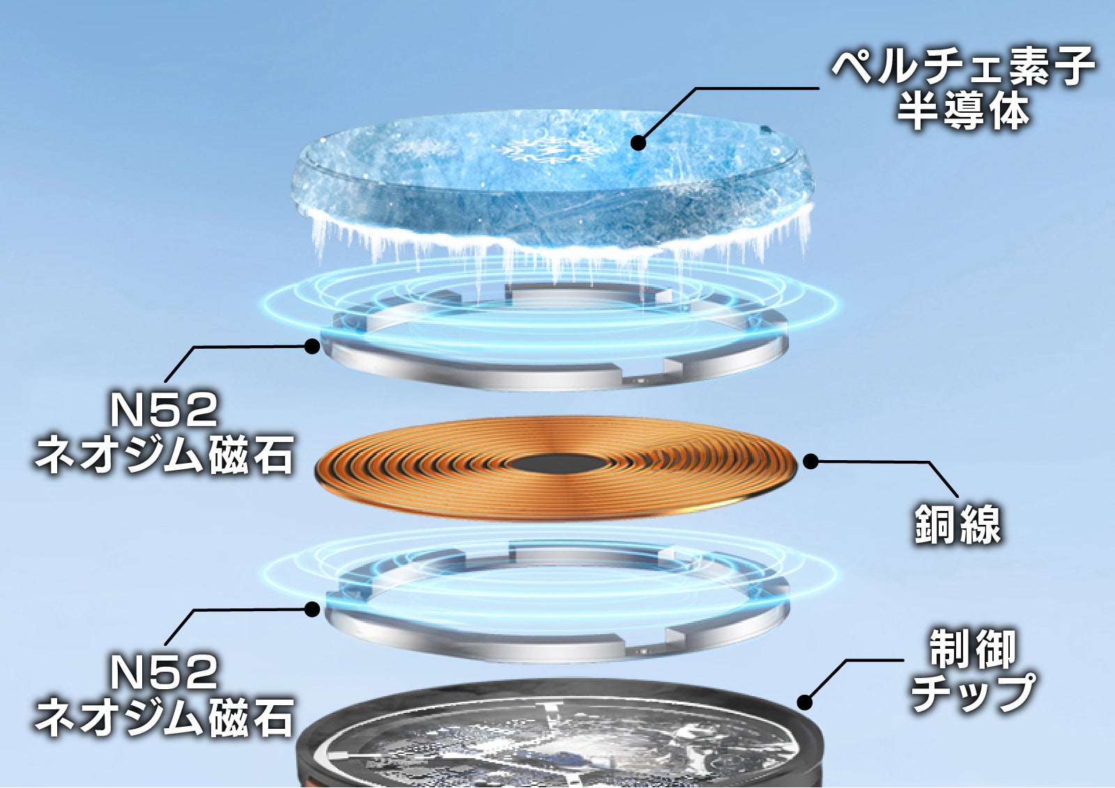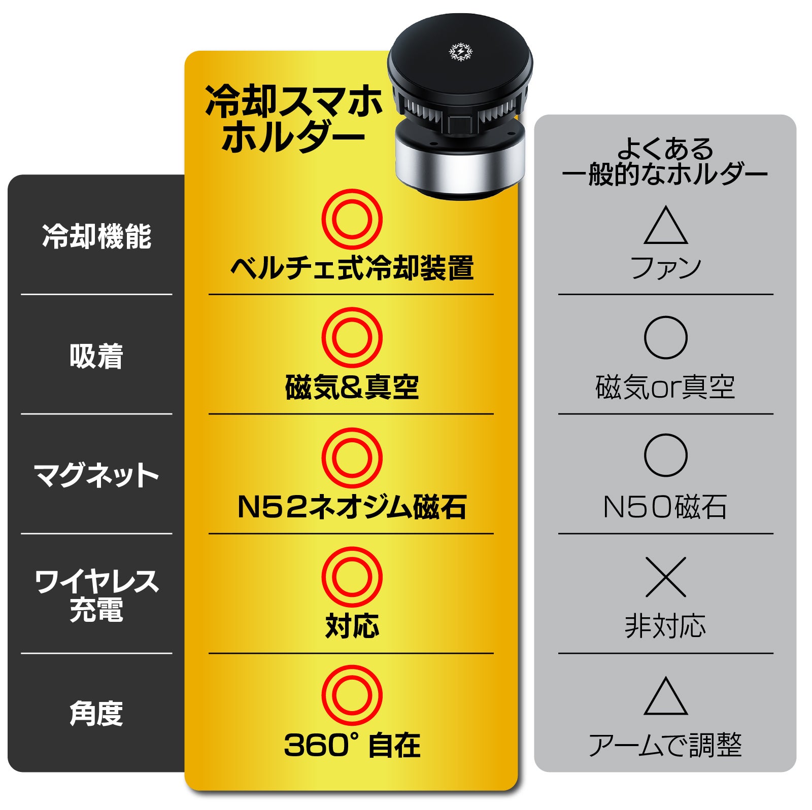 【冷却スマホホルダー】はホルダーに強力な磁力を持つN52ネオジム磁石を内蔵。